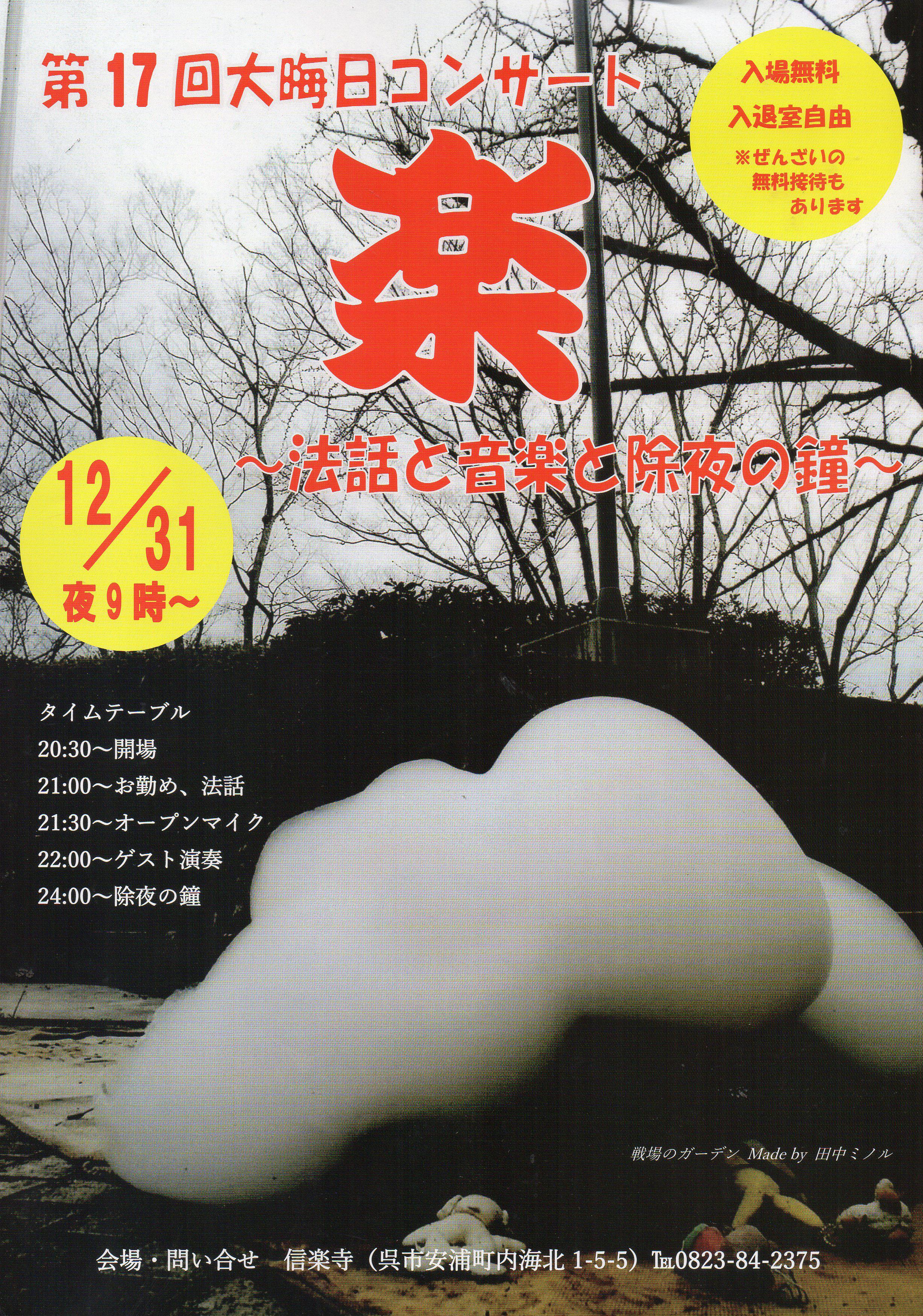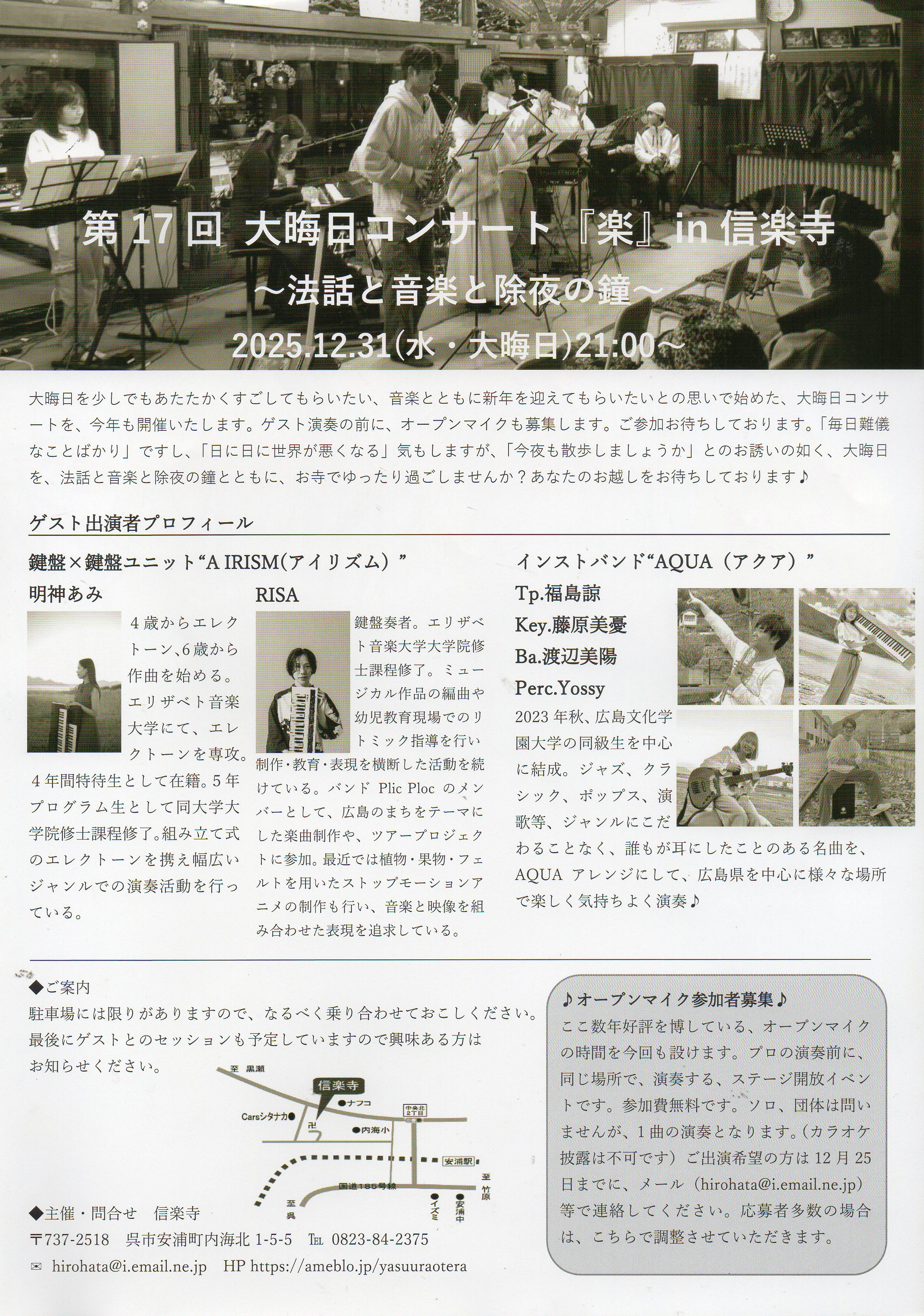 12月31日に大晦日コンサートを開催します。法話やオープンマイク、ゲスト演奏が楽しめ、入場無料で気軽に参加できます。除夜の鐘とともに心温まる時間を過ごせる催しです。