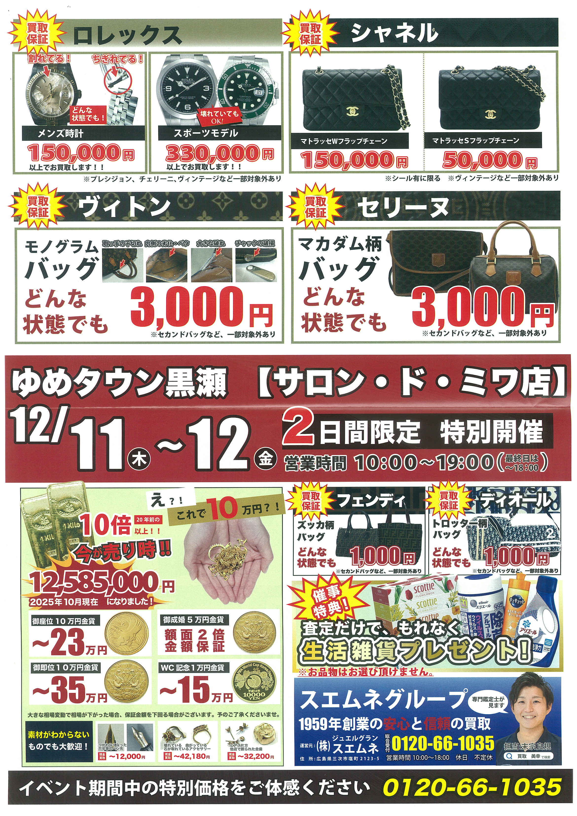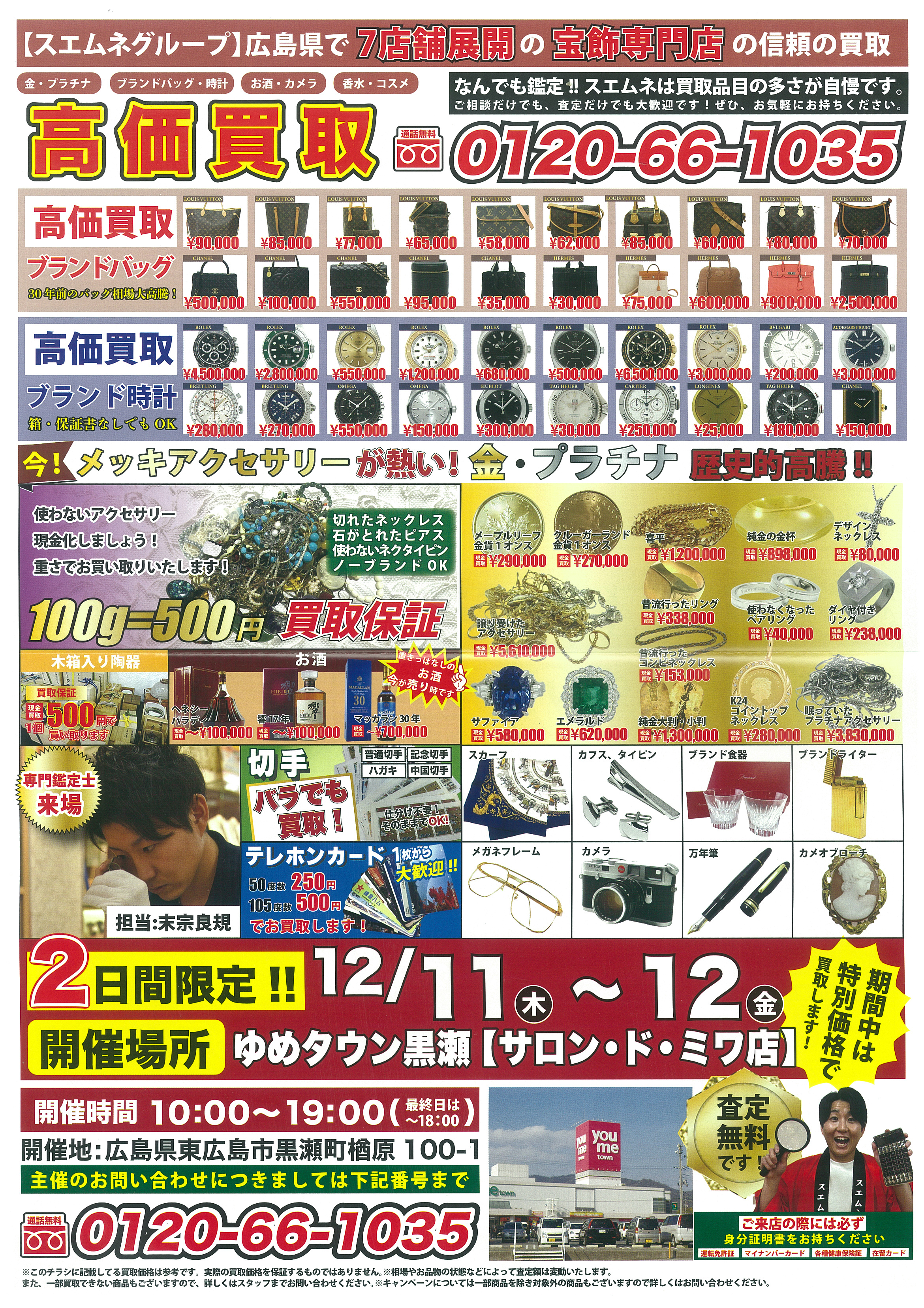 12月11日・12日に特別買取イベントを開催します。ブランド品からメッキアクセサリーまで幅広く査定し、金・プラチナも高値で買取。査定のみでもプレゼントがあり、気軽に参加できます。