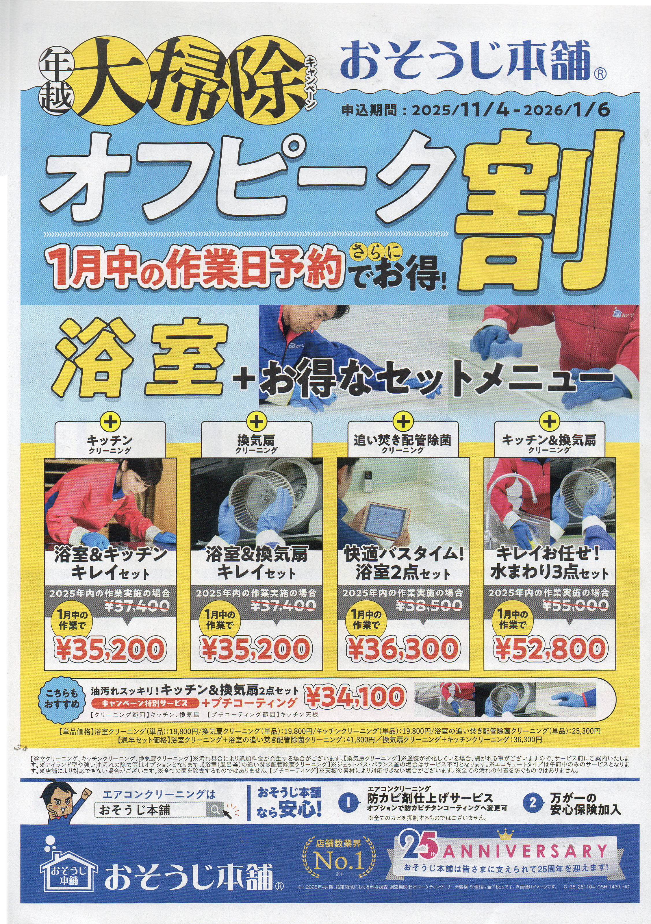 1月作業日の予約で水まわりのセットクリーニングが特別価格になります。特許取得のファインバブル洗浄も追加料金なし。大掃除を効率よく進めたい方におすすめです。