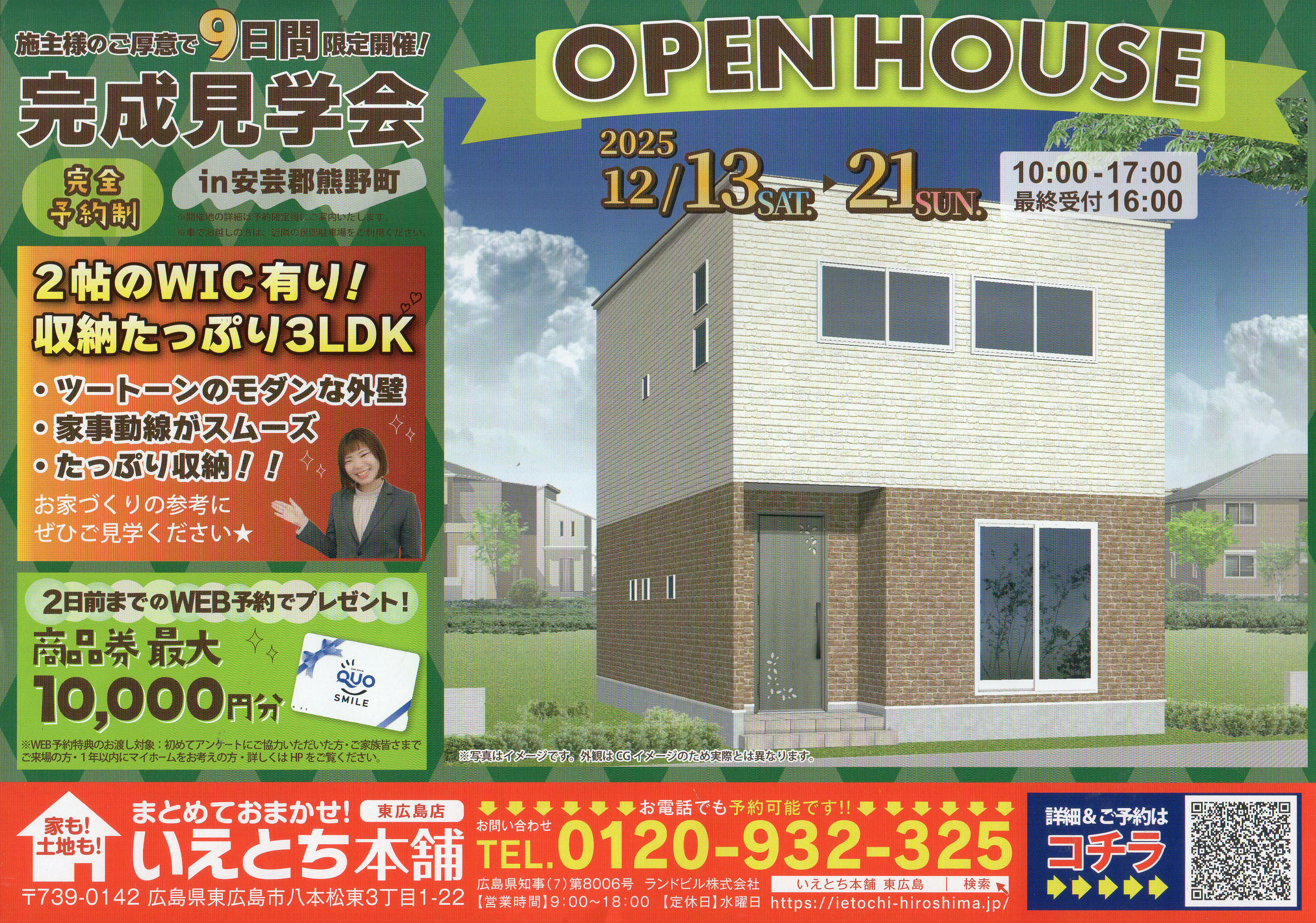 熊野町で収納充実の3LDK見学会を開催します。黒瀬町では親子で楽しめる住宅フェアも同時開催。どちらも完全予約制で、WEB予約特典もあります。年内に住まい探しを進めたい方に最適です。