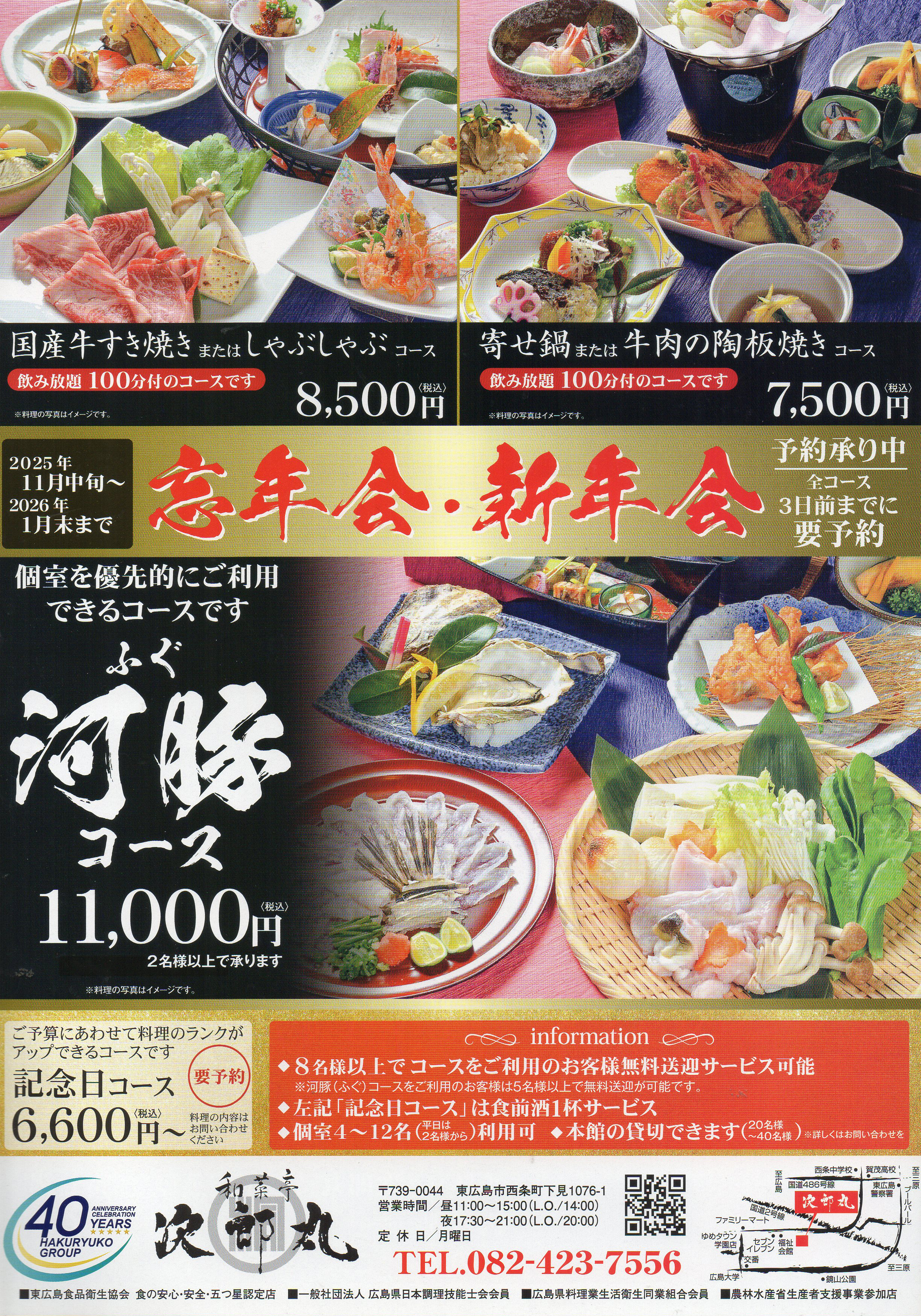 冬の味覚御膳や、すき焼き・しゃぶしゃぶなどの宴会コースをご用意しています。寄せ鍋や河豚コースも人気で、少人数から大人数まで幅広く利用できます。特別な日の食事にもおすすめです。