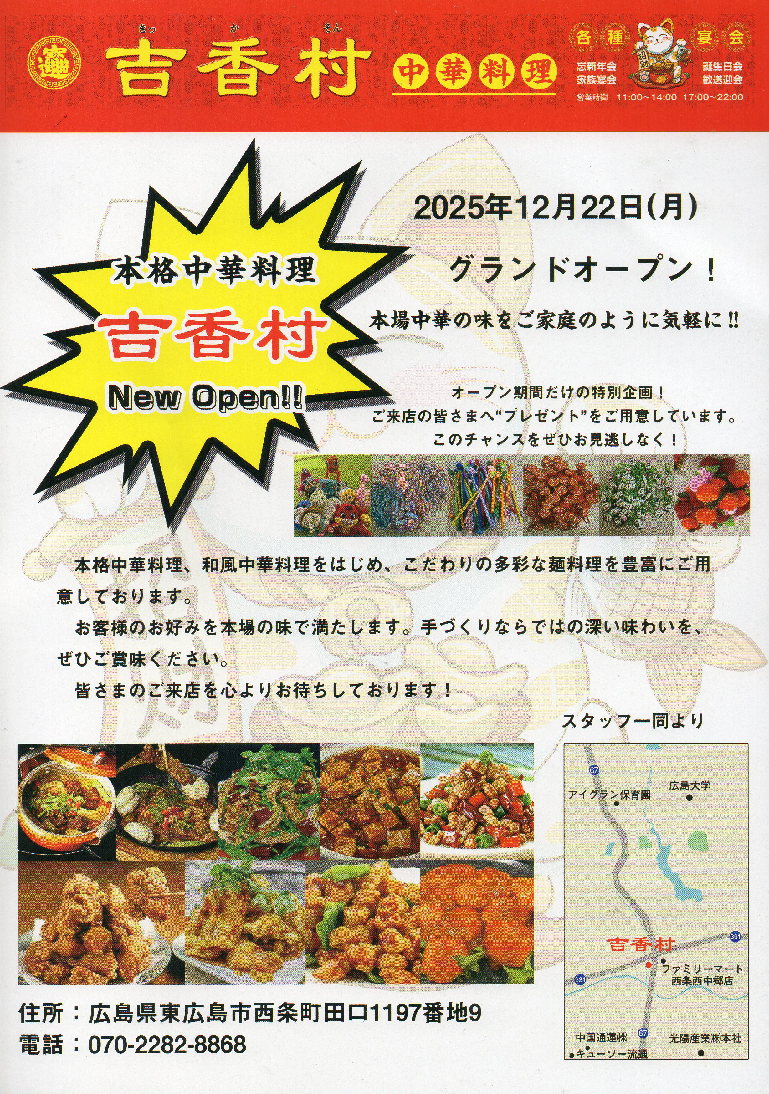 12月22日にオープンし、麻婆豆腐や点心など本格中華を気軽に楽しめます。オープン期間は来店特典もあり、家族で利用しやすいお店として楽しめる内容となっています。