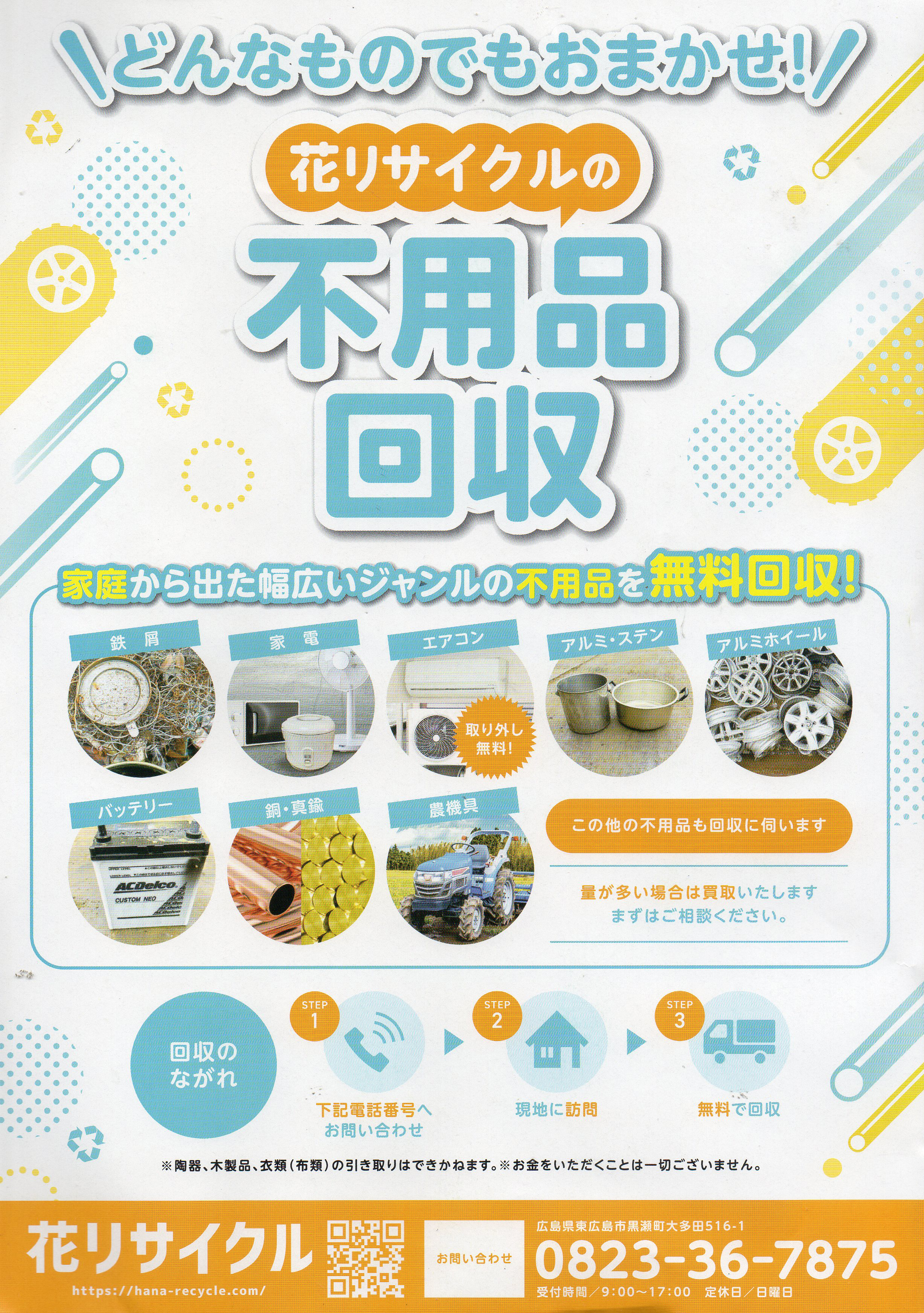 鉄くずや家電、農機具まで幅広い不用品を無料回収します。量によっては買取になる場合もあり、問合せから回収まで簡単。黒瀬町を中心に対応しています。