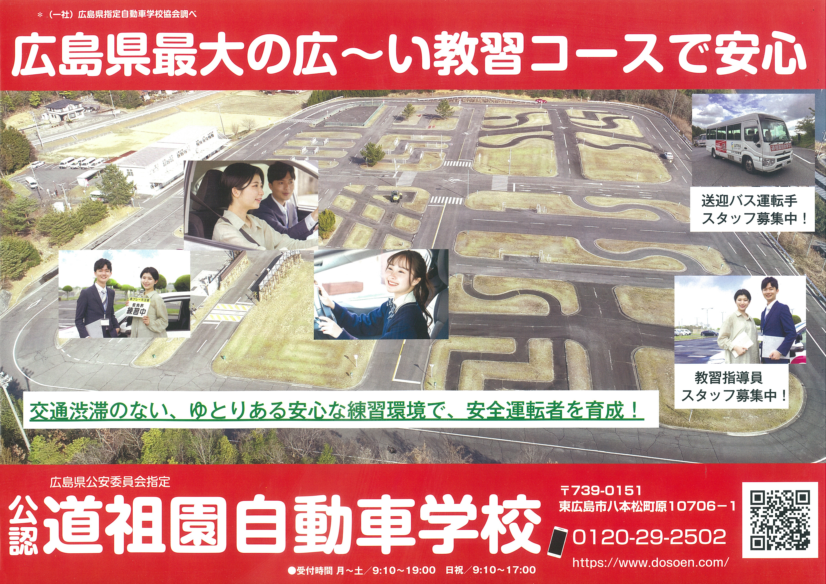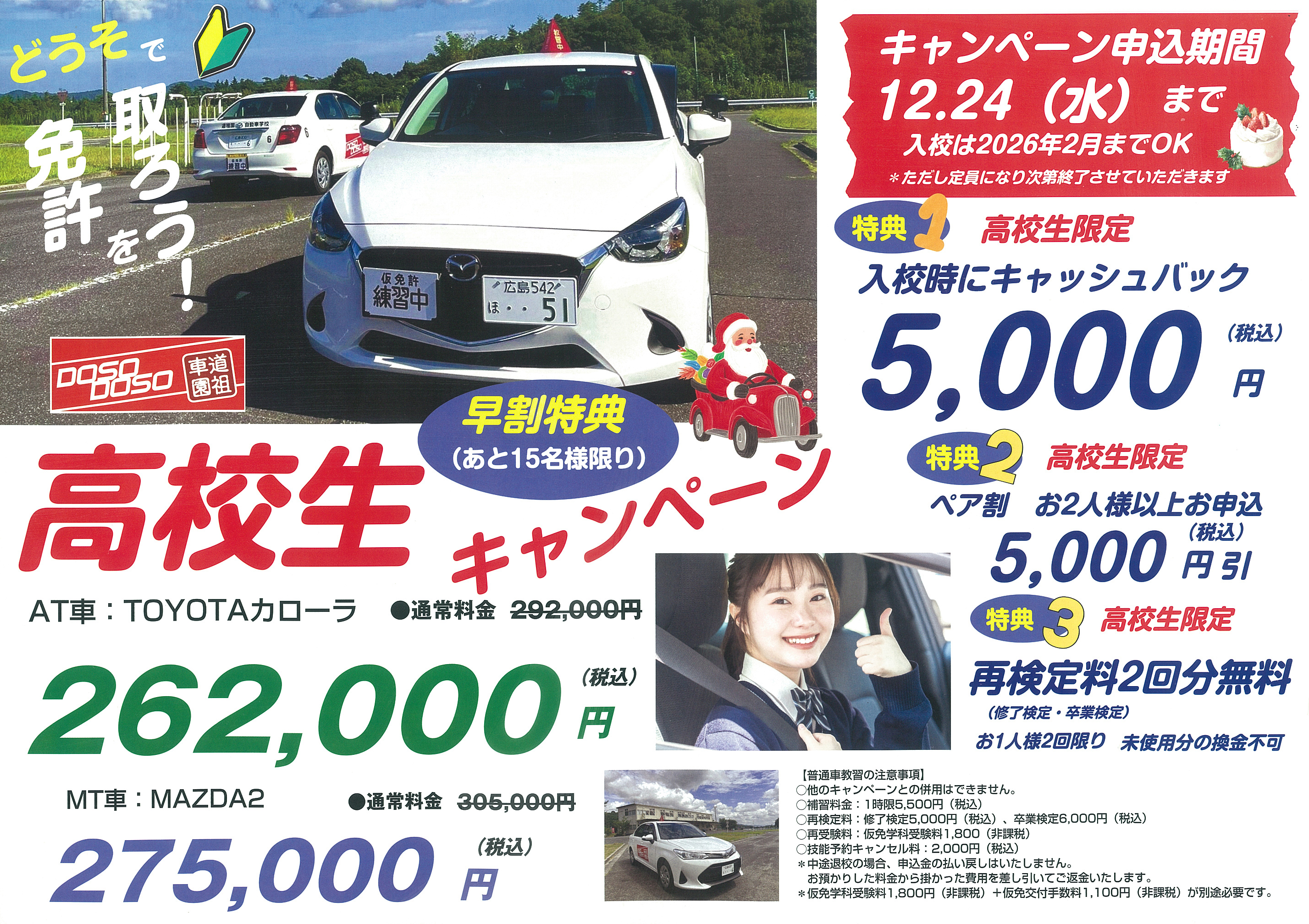 高校生キャンペーンを実施中で、入校特典やペア割が充実しています。再検定料が2回まで無料で、AT・MTともにお得に受講できます。広いコースで安心して免許取得を目指せます。