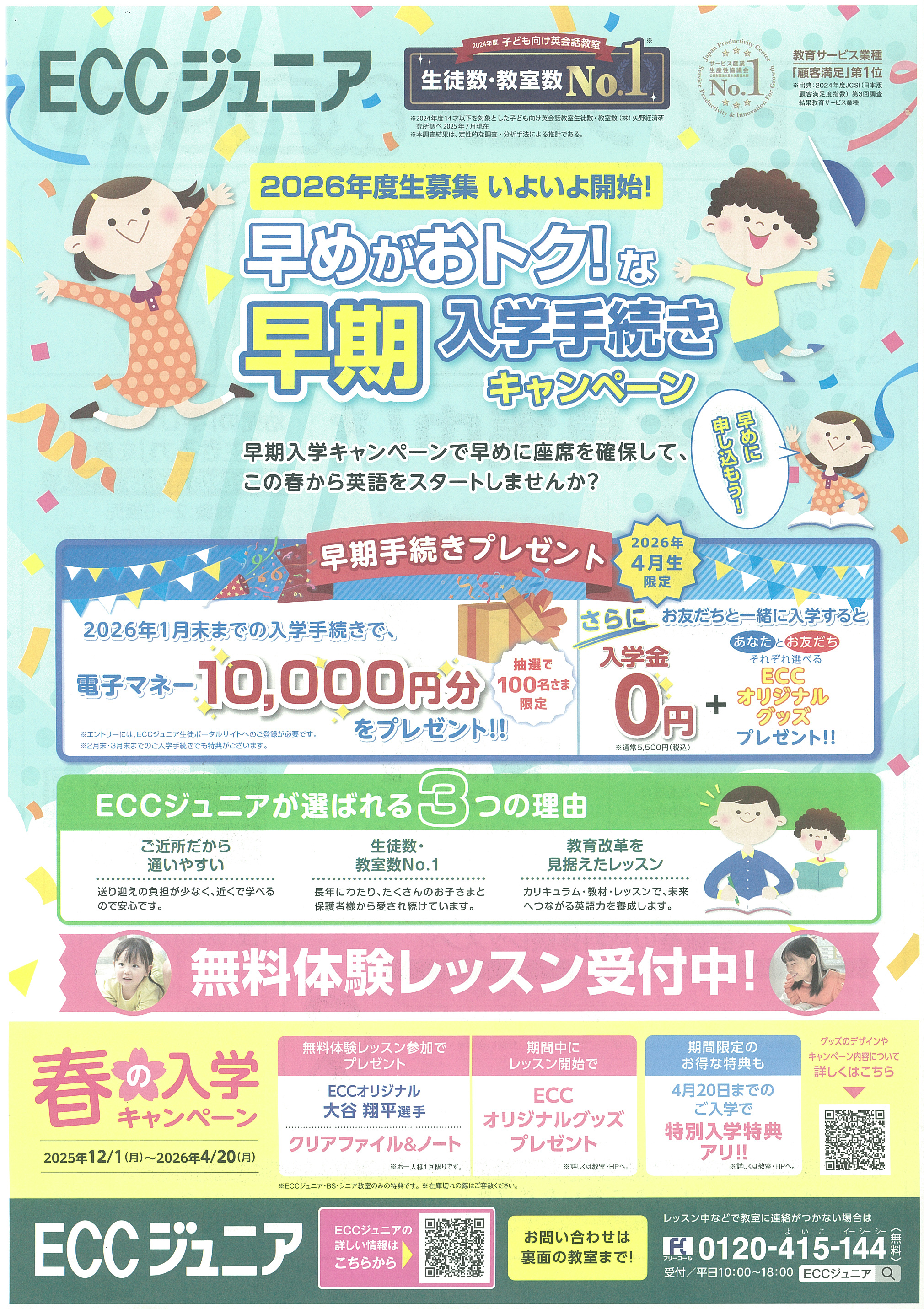 2026年度新入生の募集が始まり、早期入学キャンペーンを実施中です。入学金無料や抽選特典があり、無料体験も受付しています。春の入学特典も充実し、この時期の入学がおすすめです。