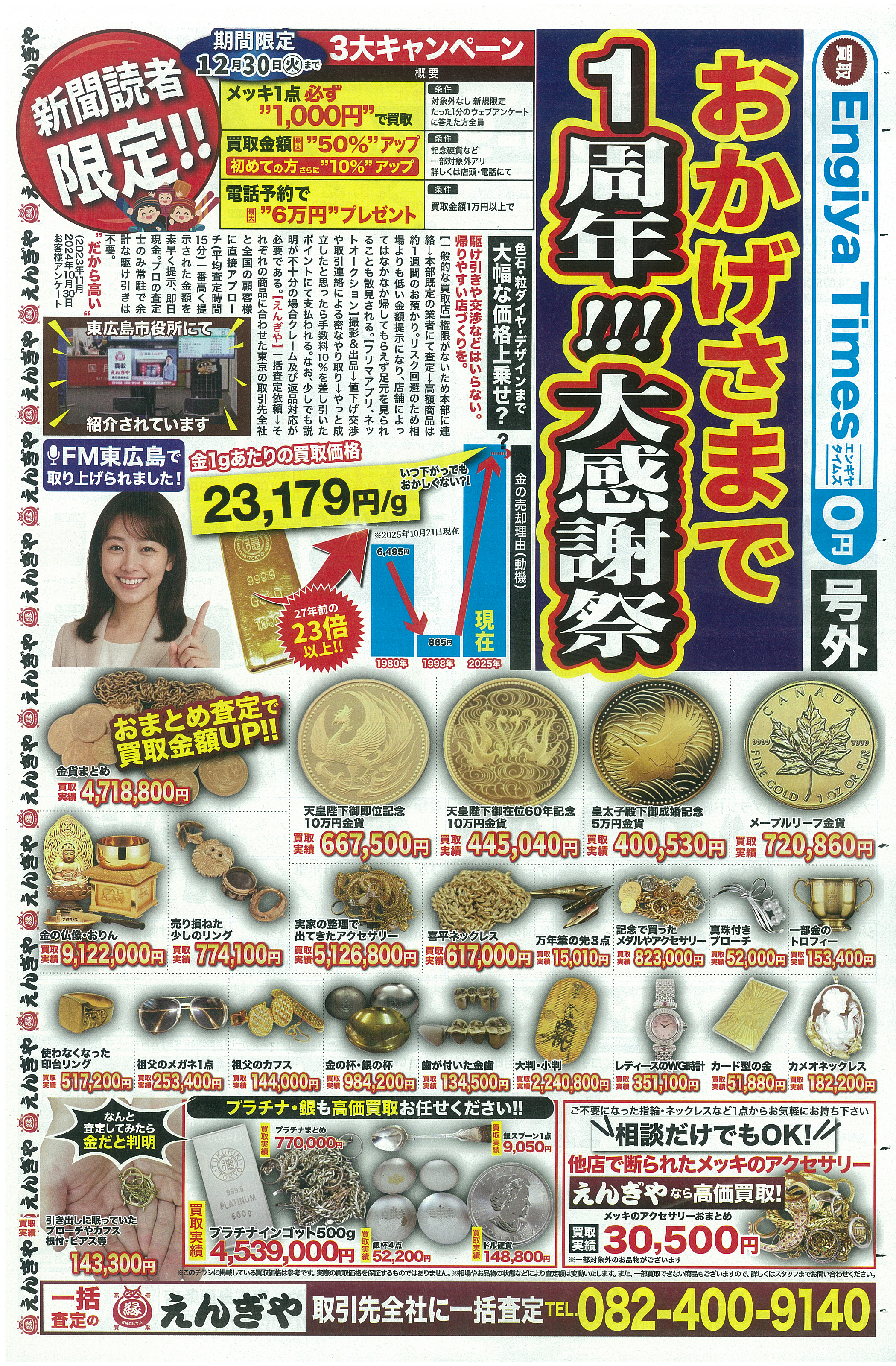 1周年を記念し、アクセサリーの特別買い取りキャンペーンを実施しています。金の高値相場も続き、壊れた指輪なども査定可能です。出張査定は無料で、初めての方にも特典があります。
