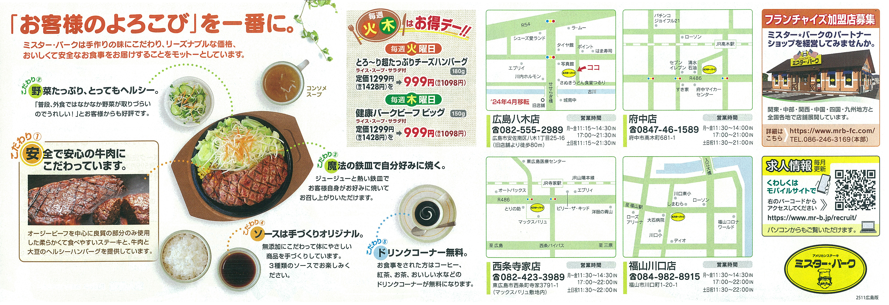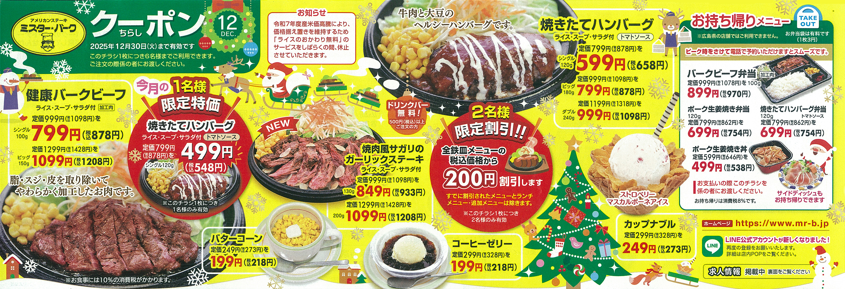 12月は健康バーグビーフが特別価格で楽しめます。1名限定の割引や鉄皿メニューの値引きなど特典も多数。サガリステーキやテイクアウト弁当も充実し、気軽に利用できます。