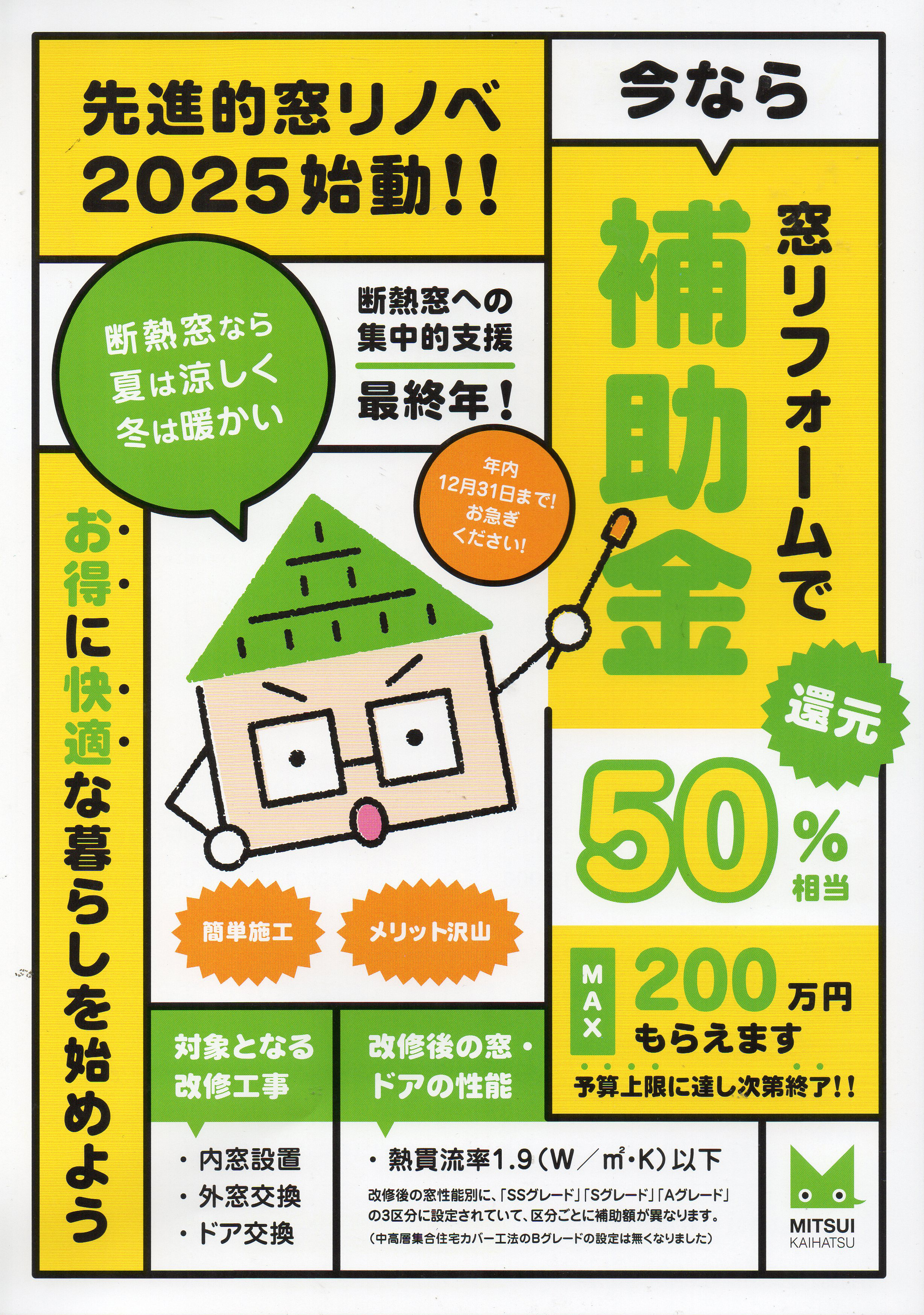 2025年開始の制度で、断熱窓やドアの改修に最大200万円の補助が受けられます。光熱費削減にも効果的で、年内の申し込みがおすすめです。相談はお気軽にどうぞ。