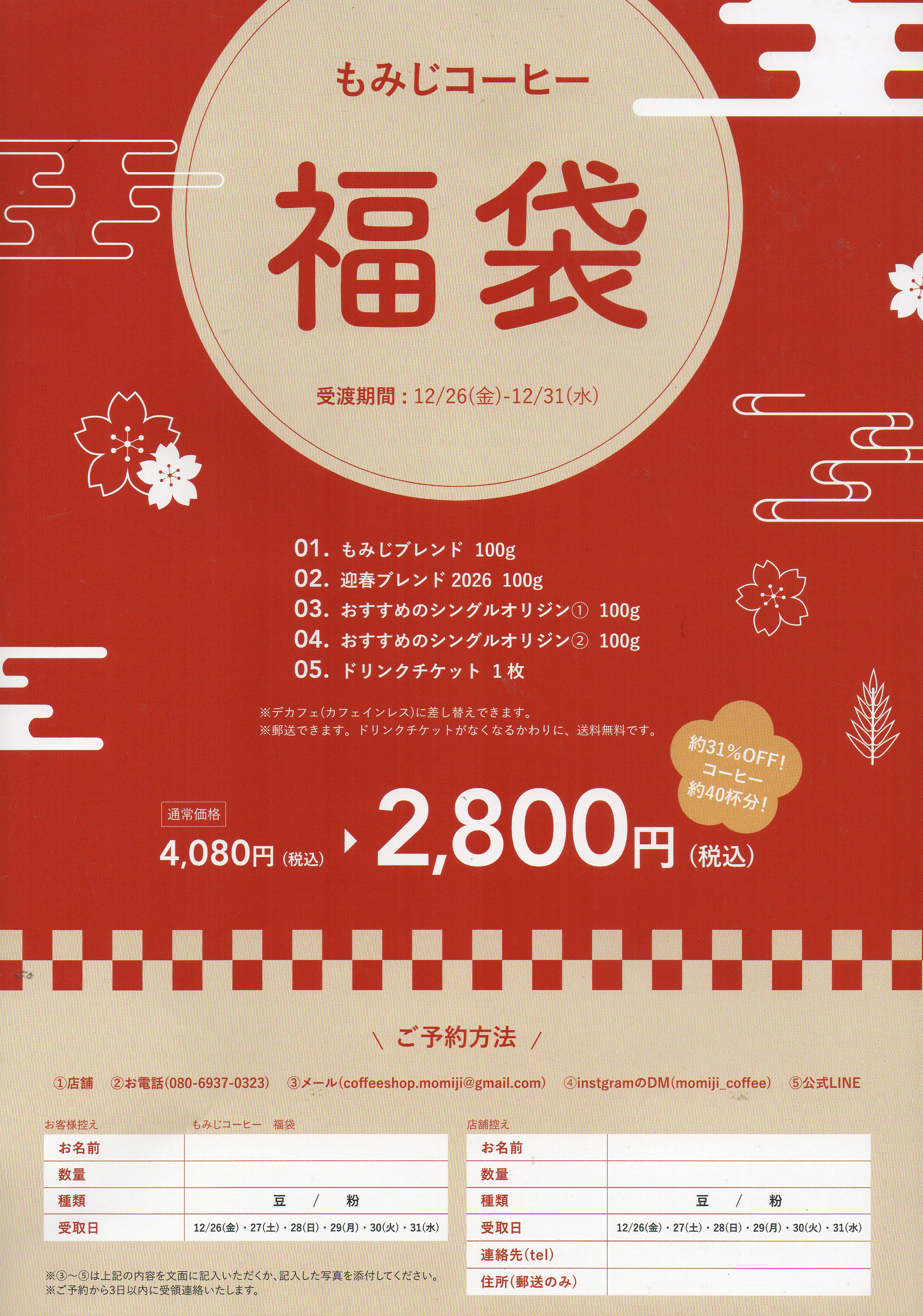 年末恒例の福袋を販売します。定番ブレンドやシングルオリジン、ドリンクチケットが入ったお得なセットです。豆・粉・デカフェも選べ、年末の贈り物にもおすすめです。