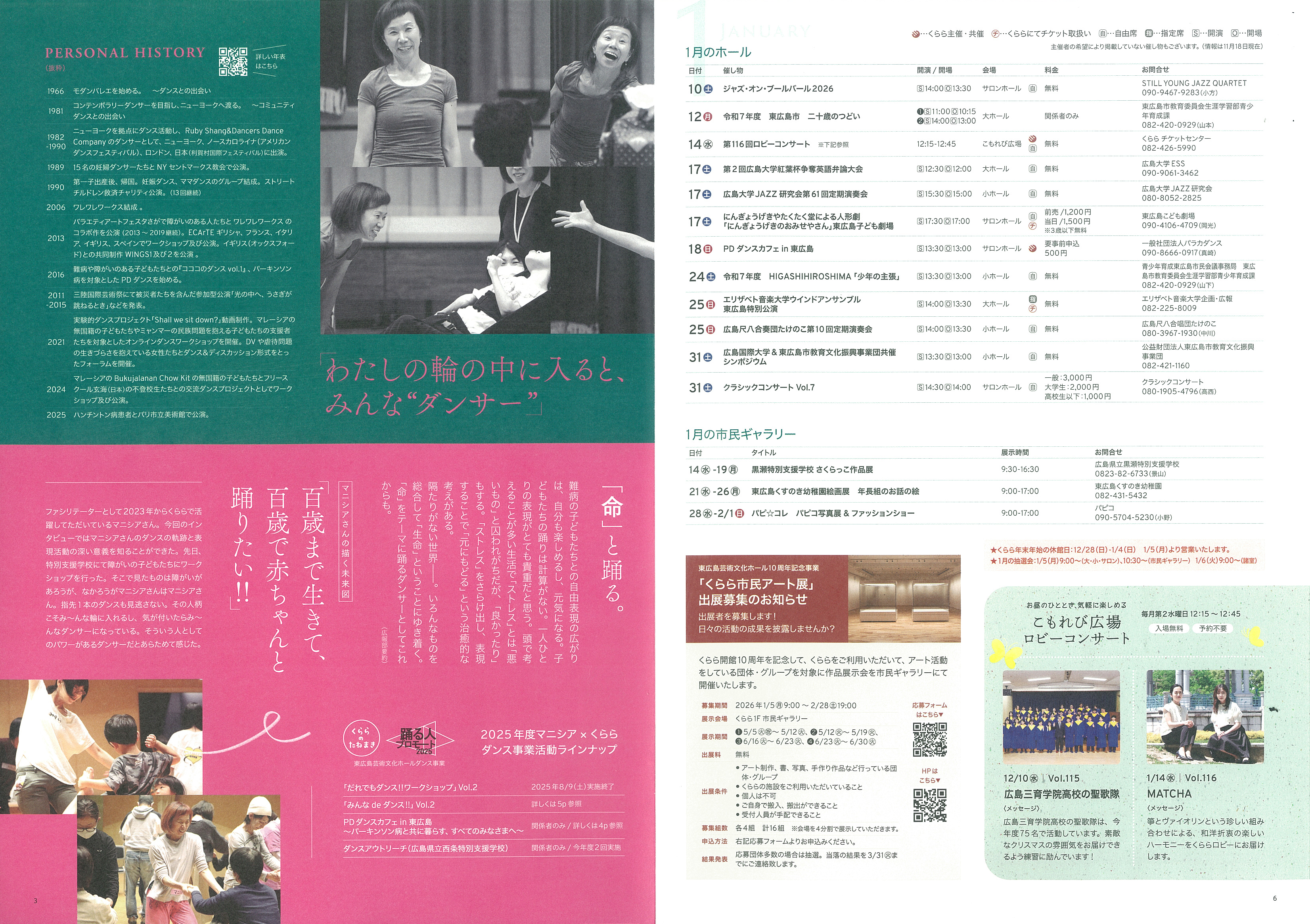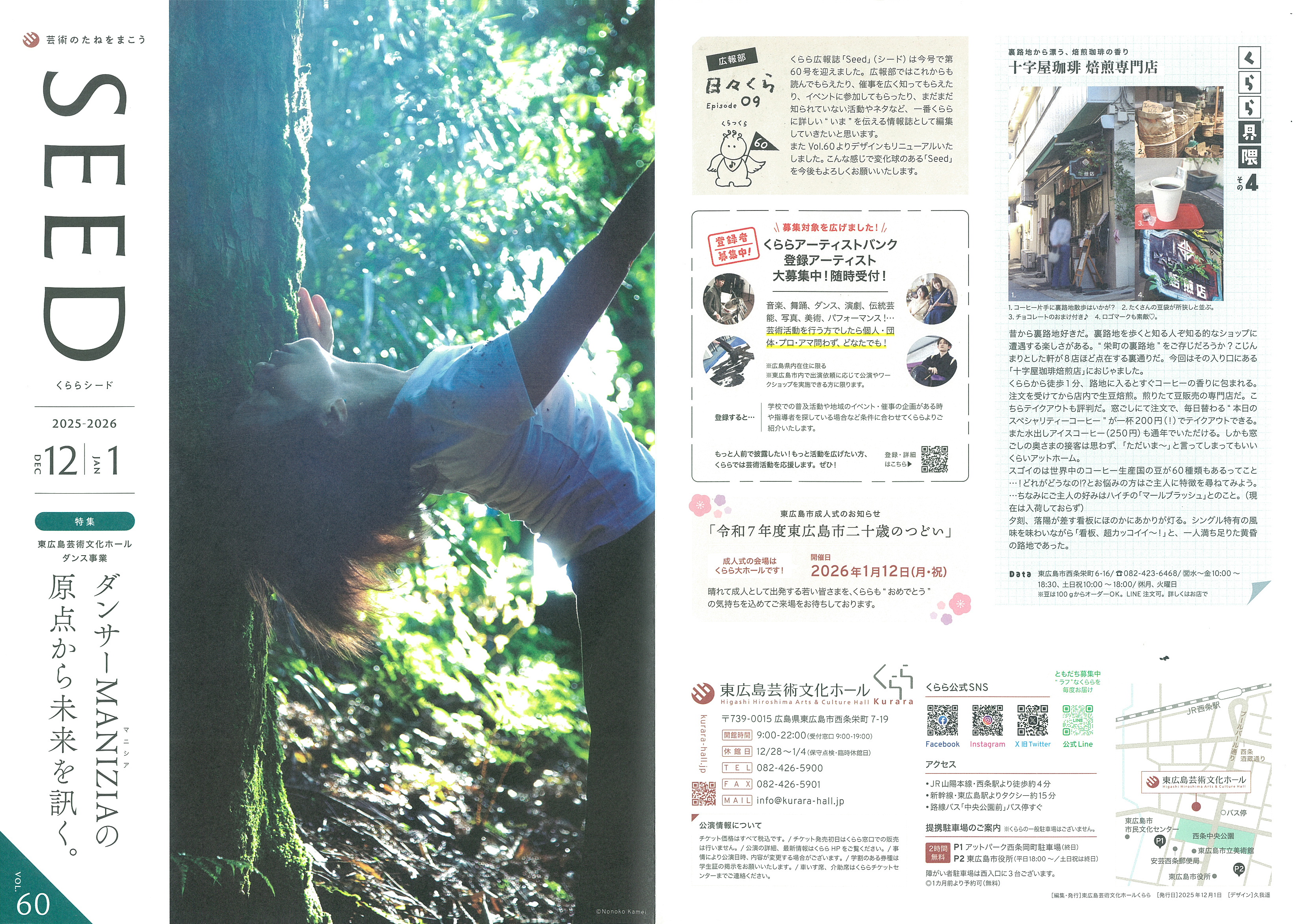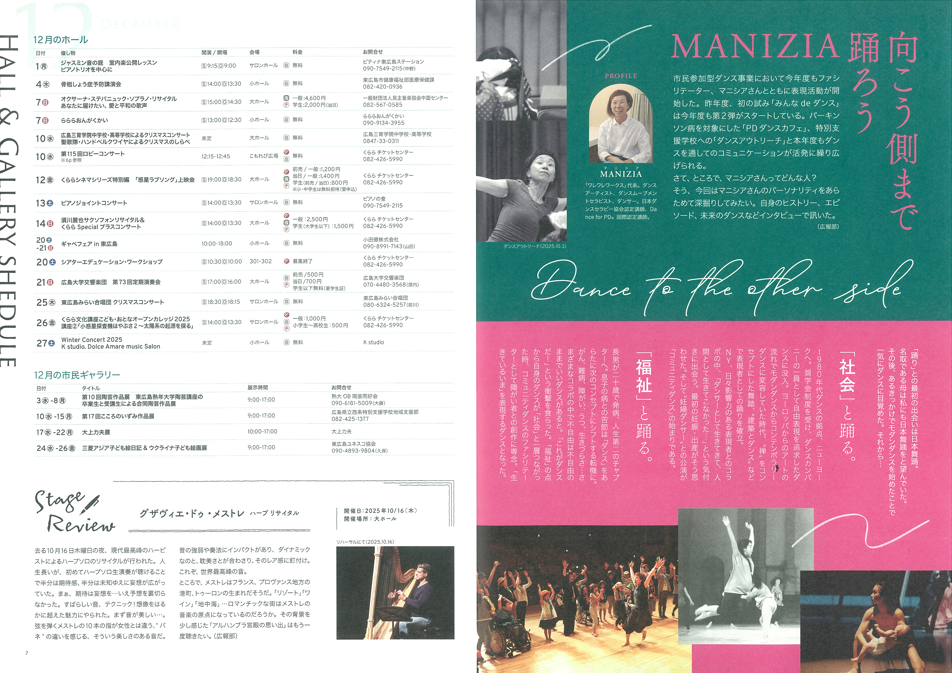情報紙「SEED」最新号では、ダンサーMANIZIAさんの特集を掲載しています。冬の期間は多彩なイベントが予定され、子どもから大人まで楽しめる公演がそろいます。公式案内で詳細をご確認ください。