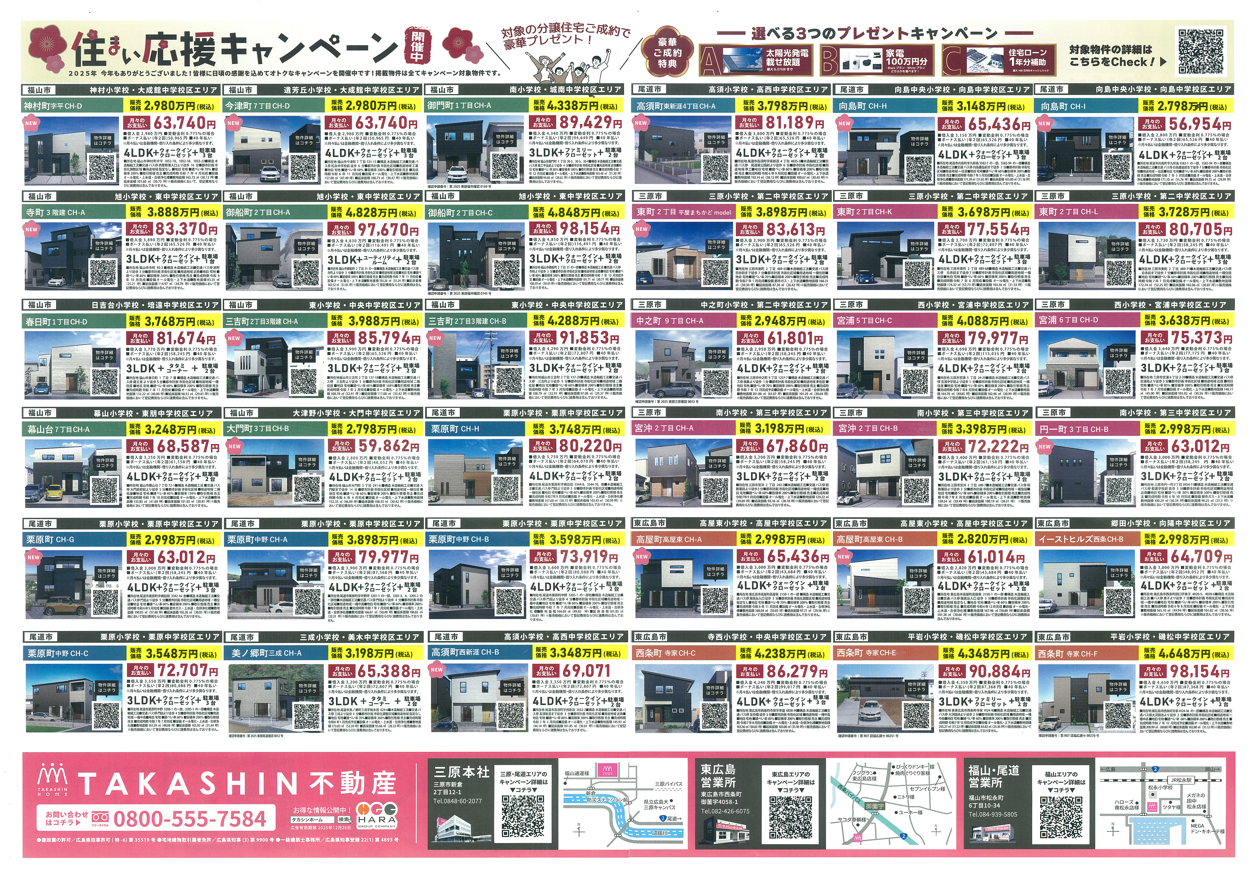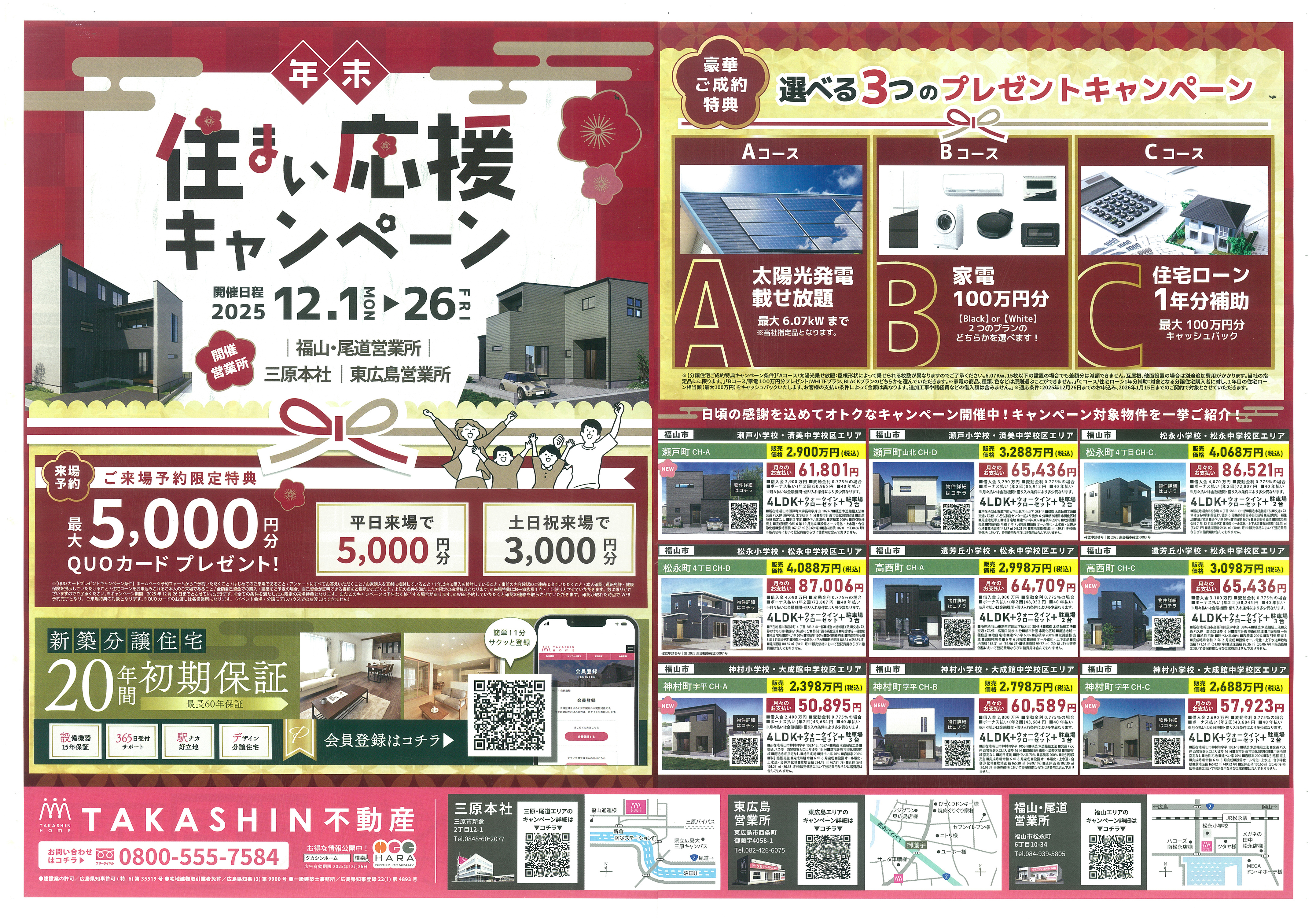 12月1日〜26日まで「年末・住まい応援キャンペーン」を開催中です。来場予約特典や成約特典が充実しており、家づくりの相談にも最適な期間です。対象物件も多数そろいます。