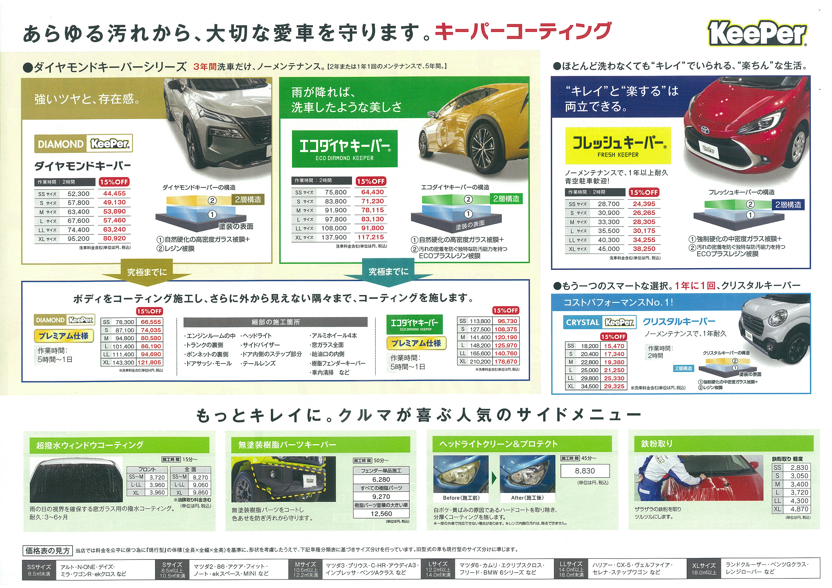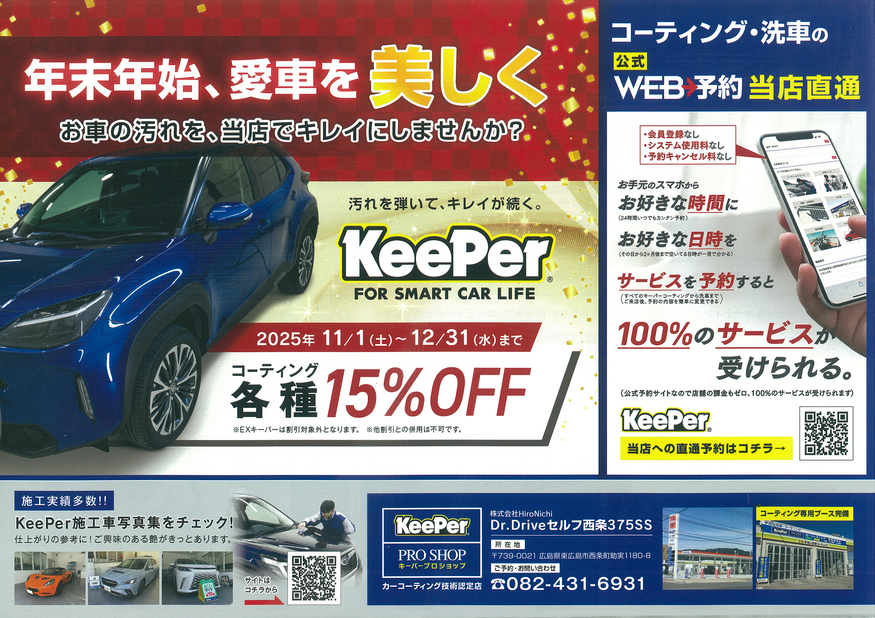 KeePerコーティングが年末まで15%OFFになるキャンペーンを実施しています。WEB予約なら手数料不要で便利です。多彩なメニューが選べ、年末に向けて愛車をきれいにできます。