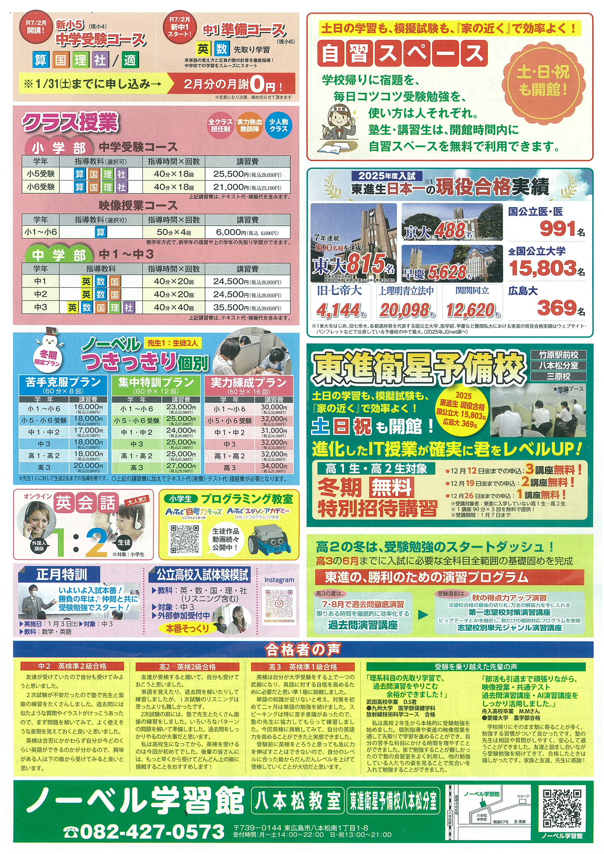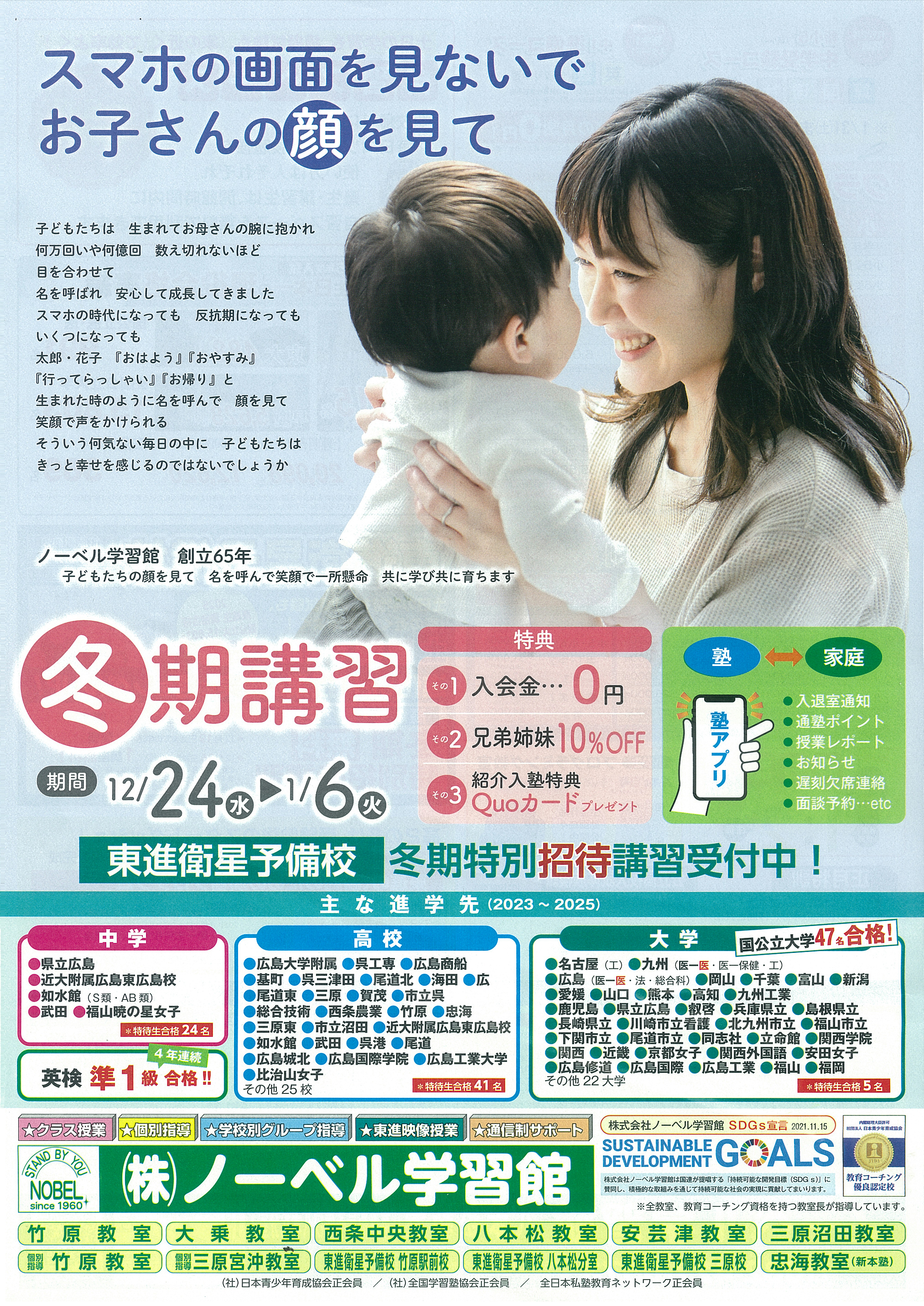 12月24日〜1月6日まで冬期講習を開講します。入会金0円や特典もあり、個別指導や英会話など多彩なコースから選べます。基礎固めや受験対策に活用できる講座がそろっています。