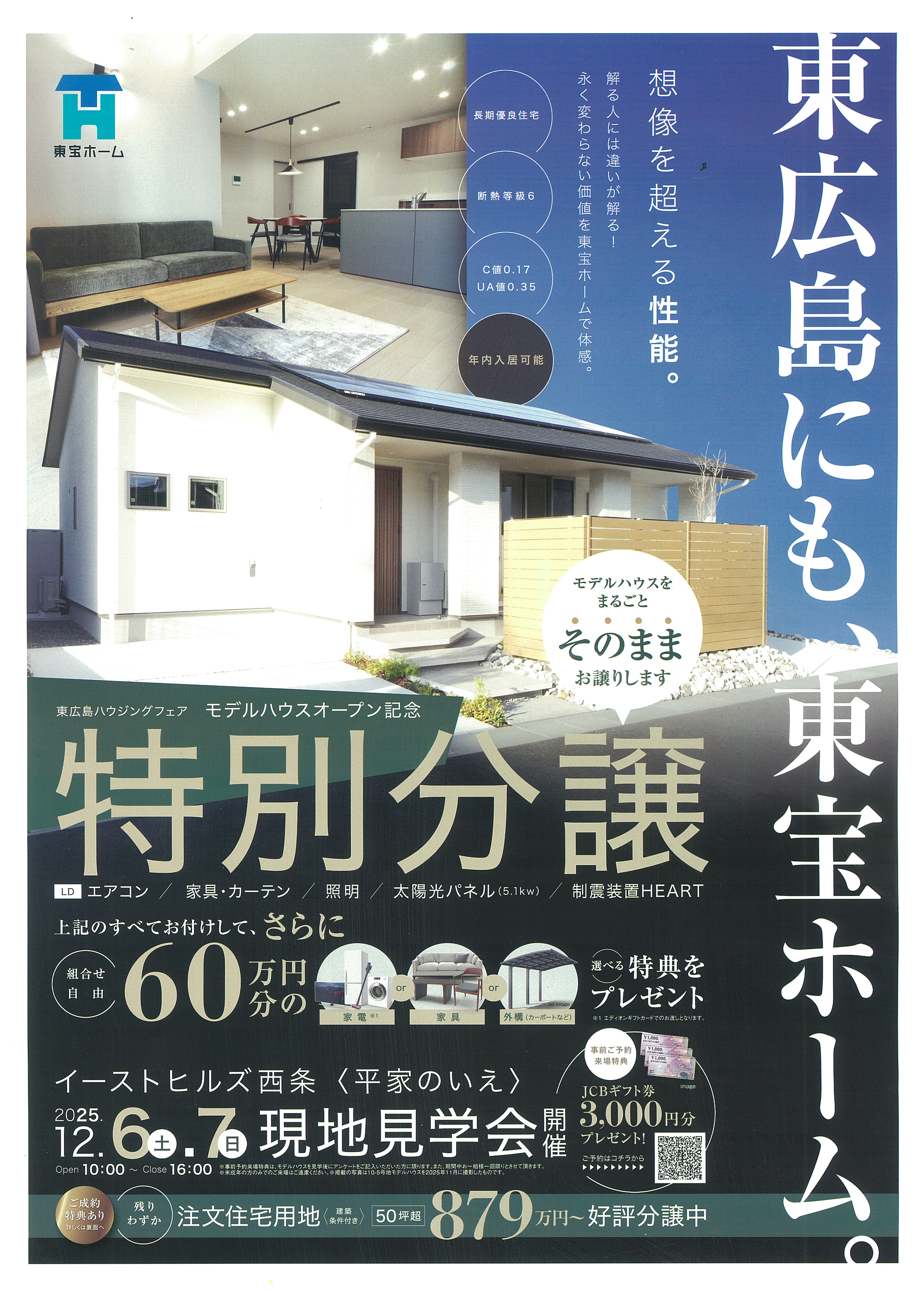 西条の〈平家のいえ〉を特別分譲しています。家具・家電付きでそのまま暮らせる住宅です。12月6日・7日には見学会を実施します。平屋の快適さを現地で体感できます。