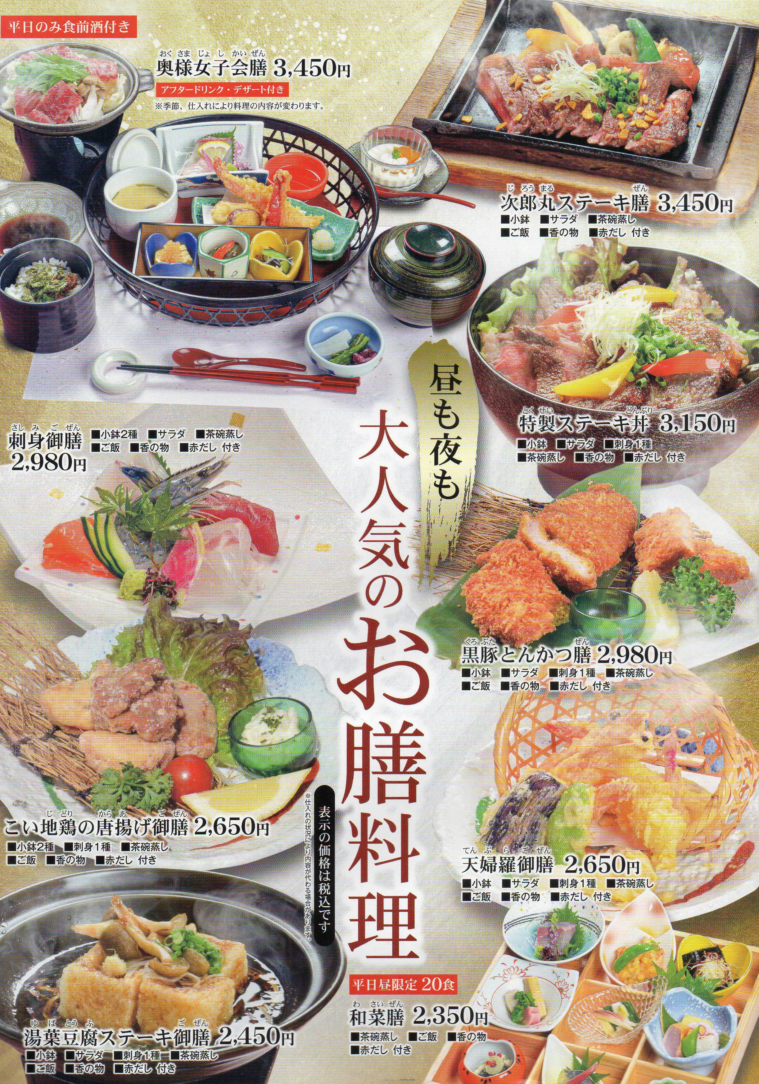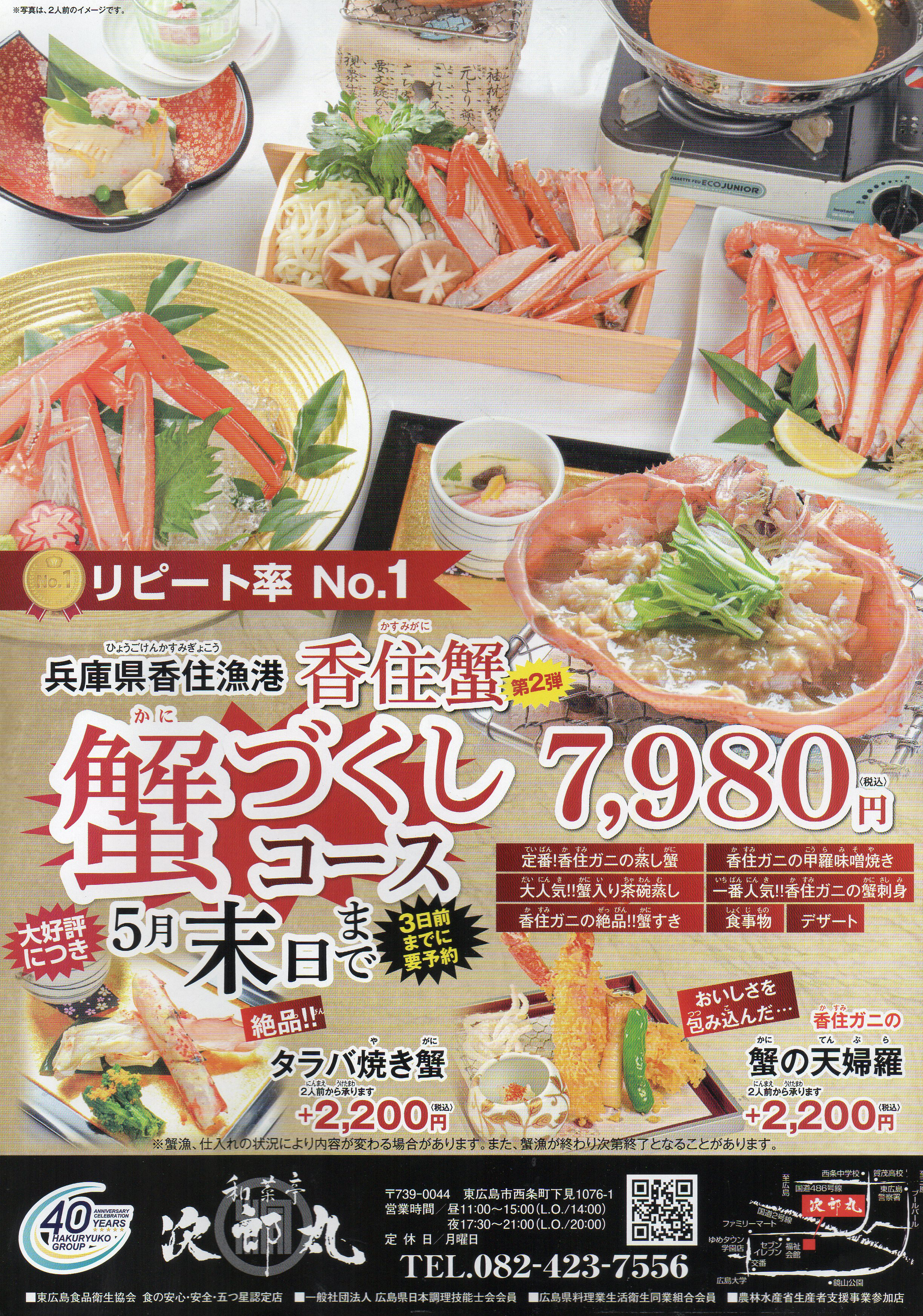 西条町下見の和食店、次郎丸では香住ガニの蟹づくしコースを5月末まで提供しています。蒸し蟹や焼き蟹、天ぷらなど多彩な料理で旬の味覚を堪能できる人気コース。ステーキ膳や刺身御膳などの定食メニューも充実しており、家族の食事や特別な日にもおすすめです。