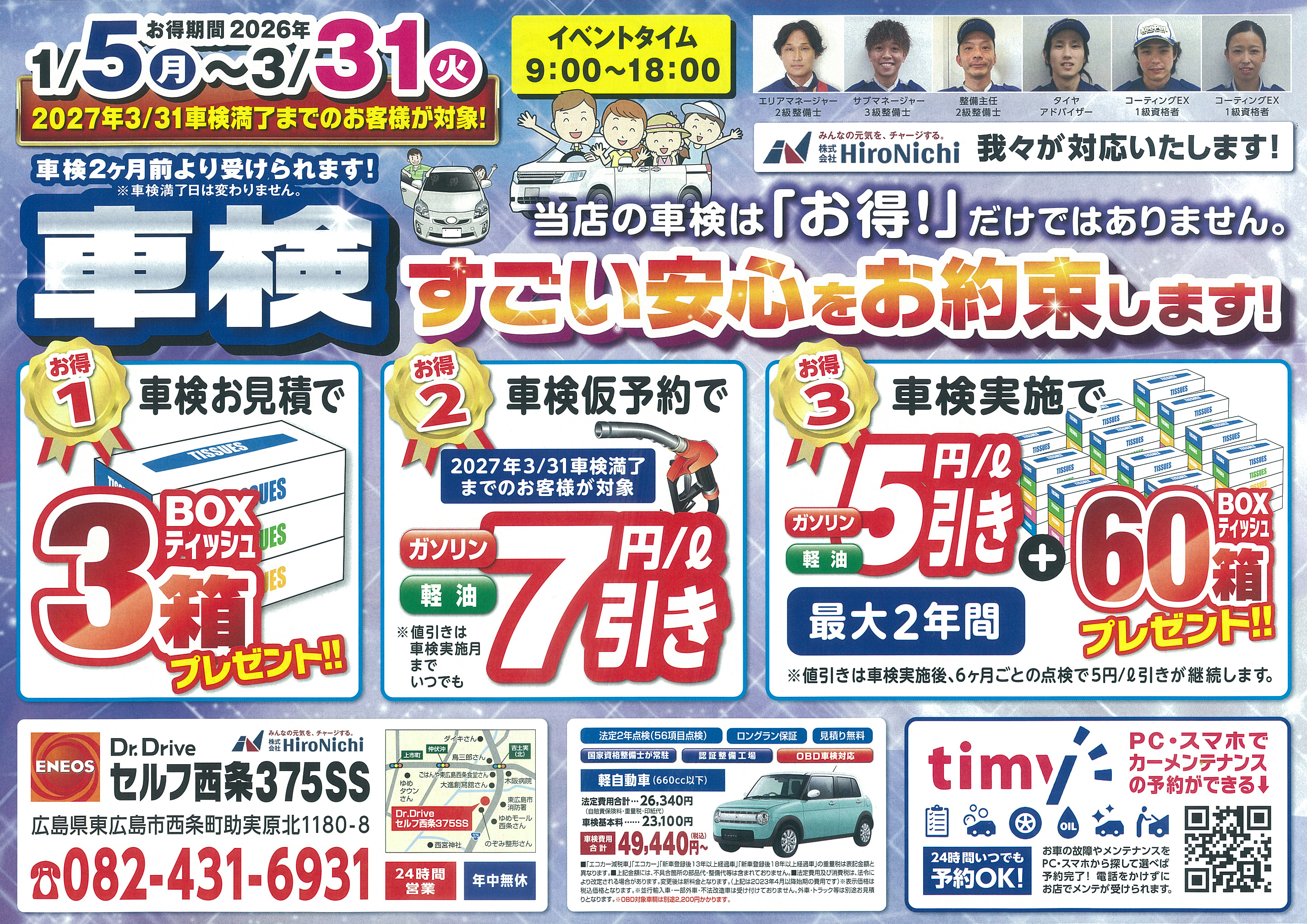 Dr.Driveセルフ西条375SSでは車検や点検に関するお得なイベントを実施しています。車検見積もりや予約で特典が用意され、日用品プレゼントやガソリン値引きなどのメリットも充実。12カ月点検の特別価格やメンテナンスパックもあり、愛車の状態を整える機会として利用できます。