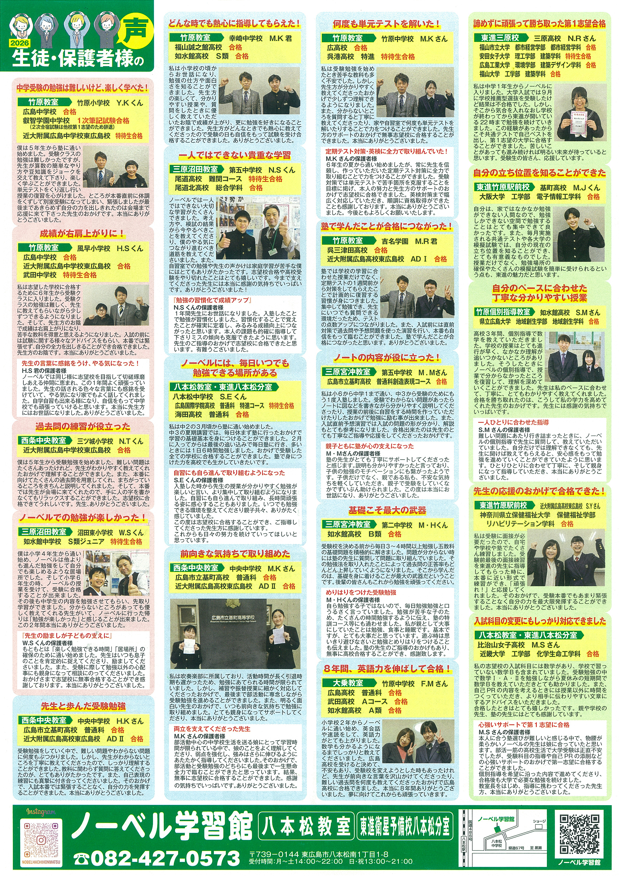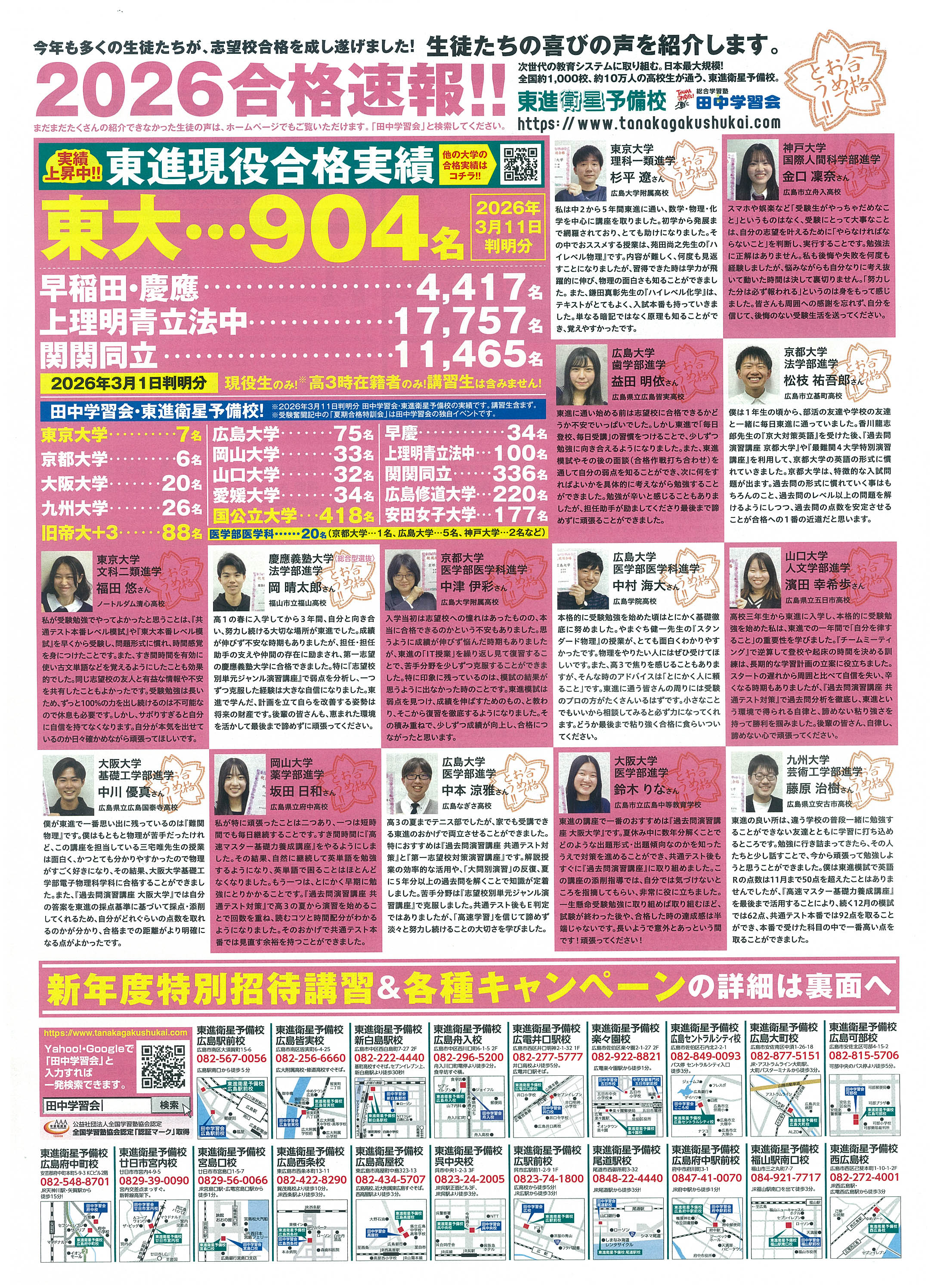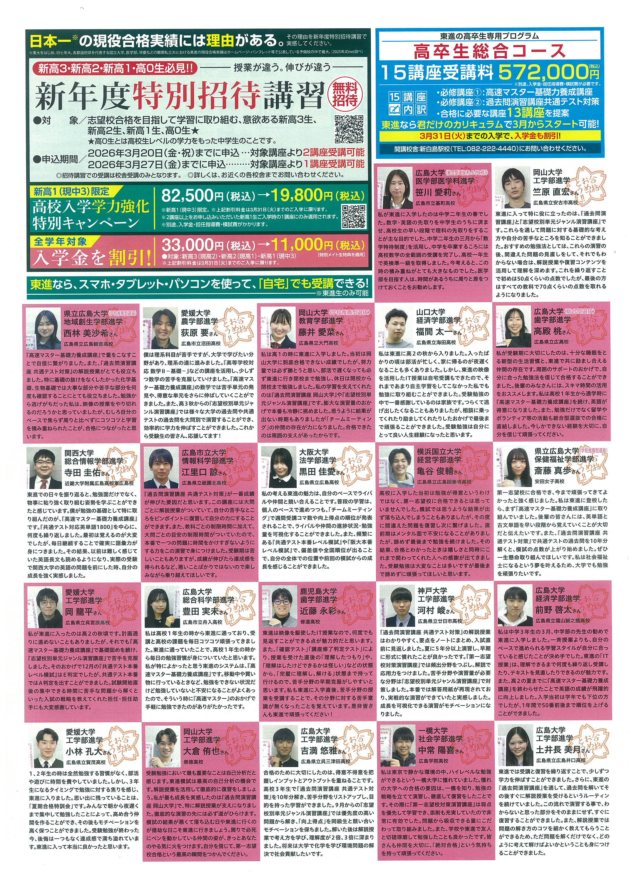 東進衛星予備校では2026年度入試で多くの難関大学合格実績を達成しています。映像授業と担任指導を組み合わせた学習システムで、効率よく学力を伸ばせるのが特徴。新年度に向けた特別招待講習も実施されており、志望校合格を目指す高校生をサポートしています。