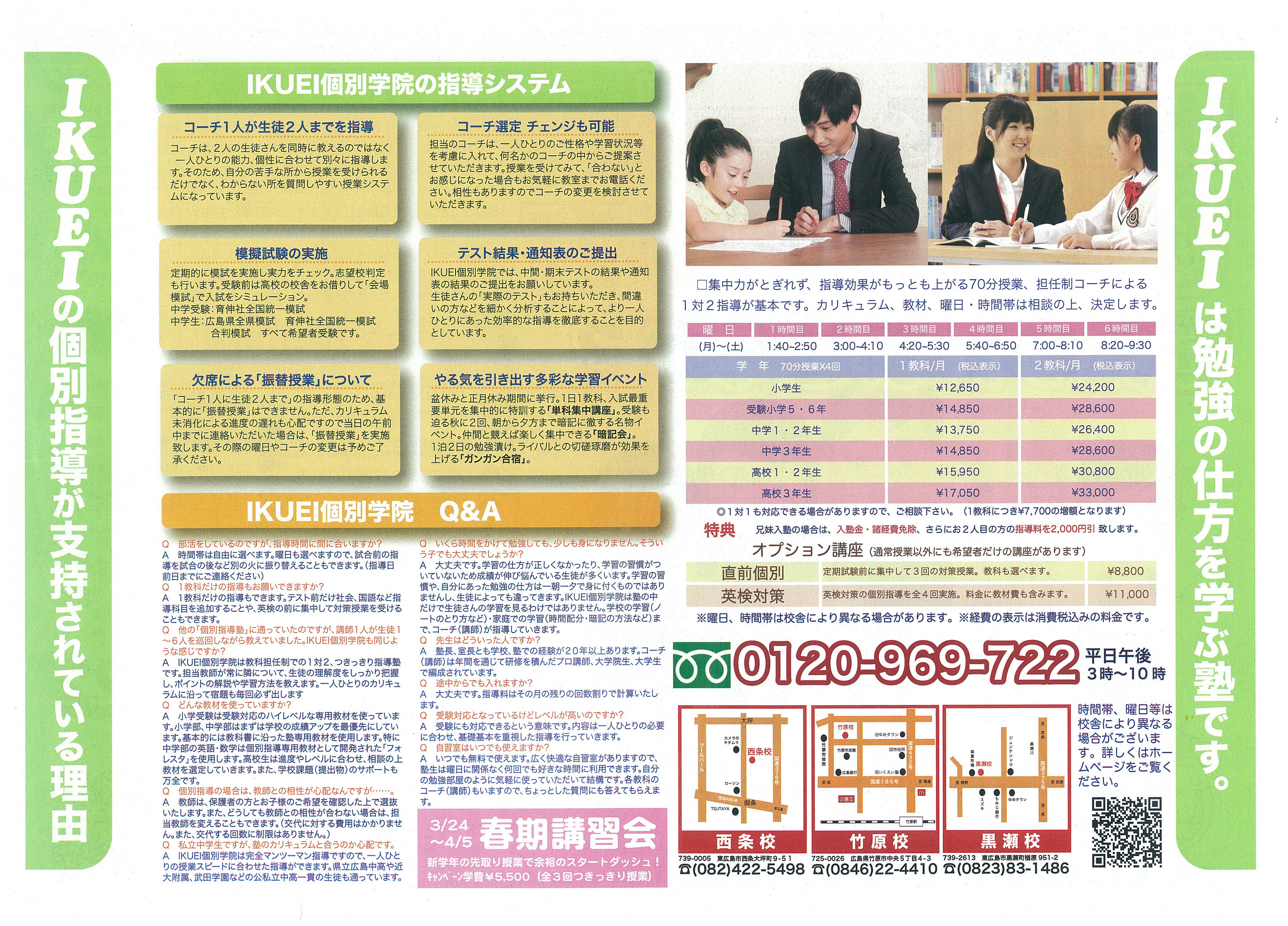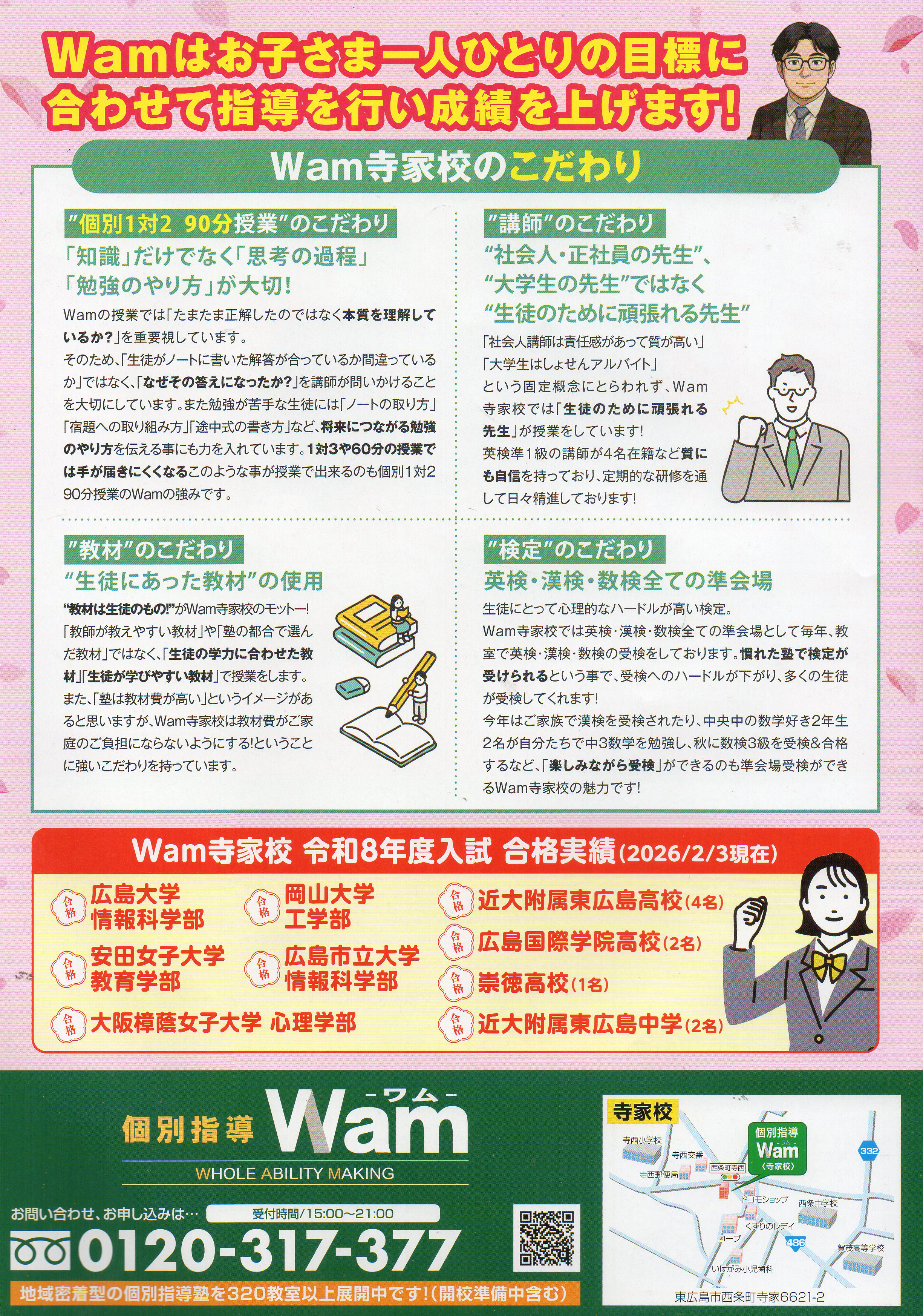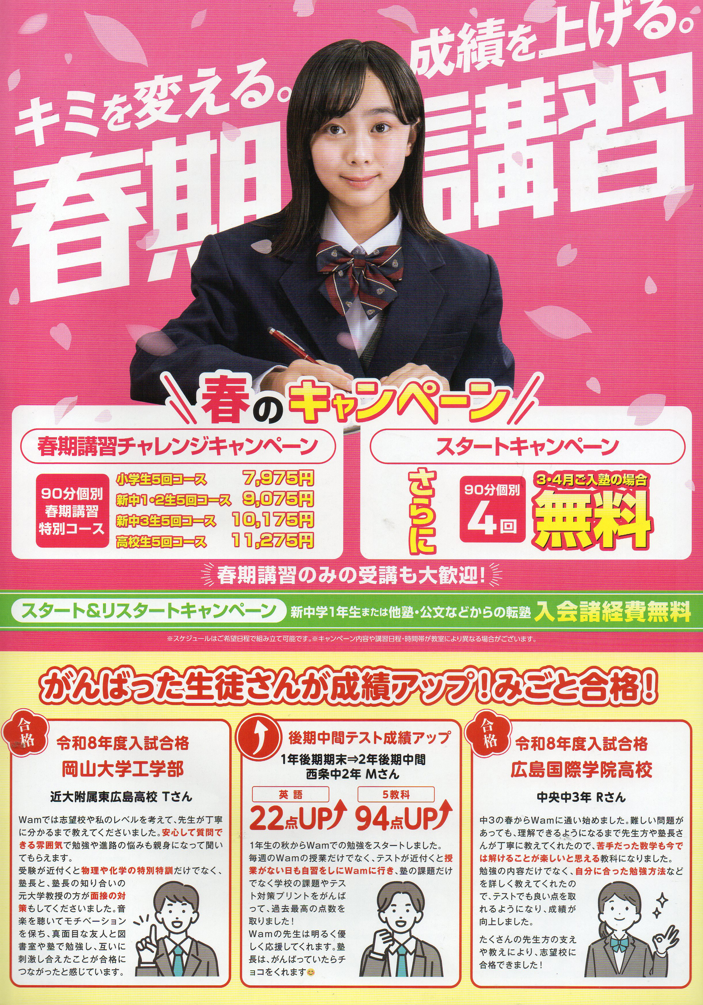 個別指導Wamでは春の講習キャンペーンを実施しています。1対2の90分個別指導で、生徒の理解度に合わせて丁寧に指導。勉強の進め方や考え方もサポートし、苦手克服や成績向上を目指します。英検や各種検定対策にも対応しています。