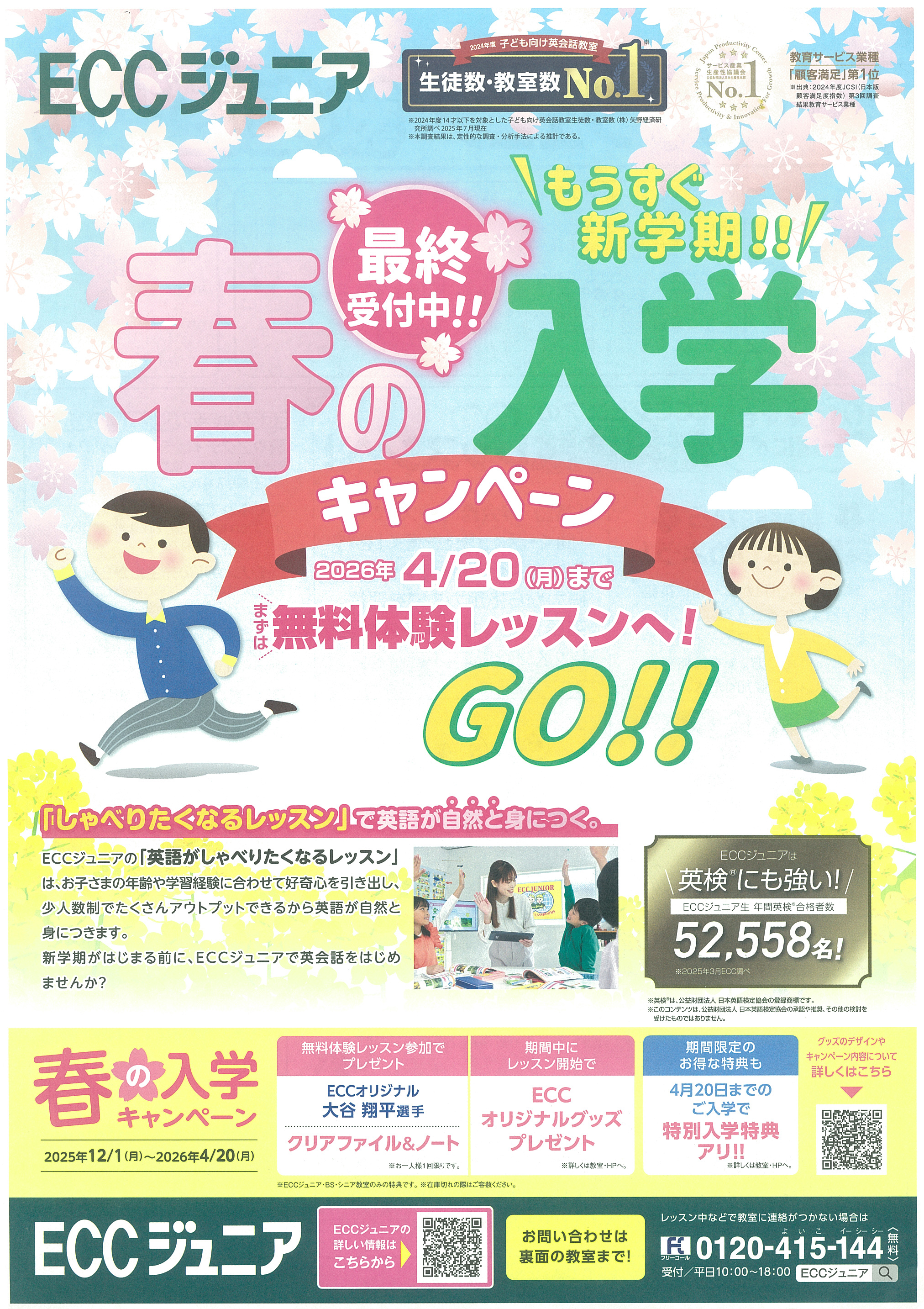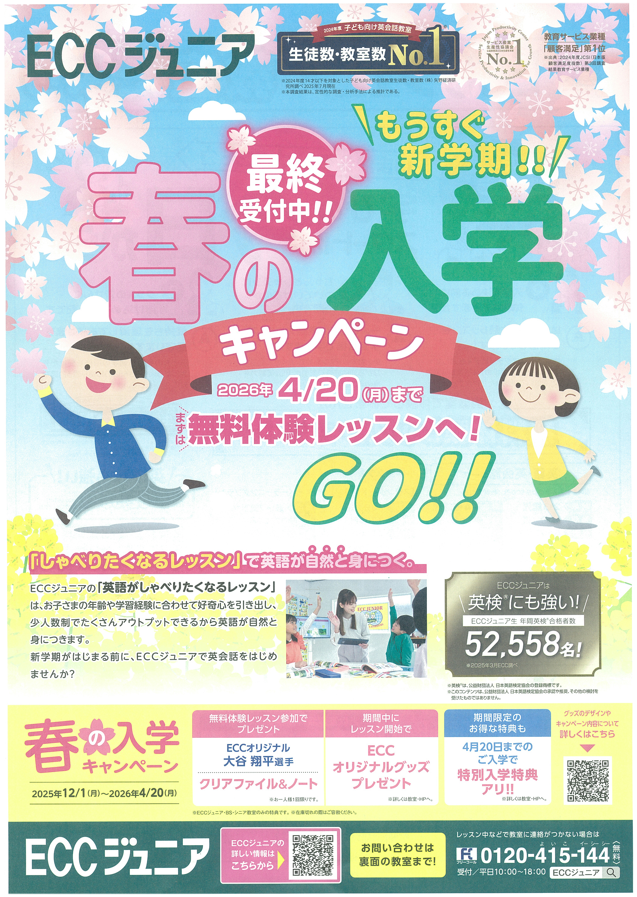 ECCジュニアイーストヒルズ東子教室では、新学期に向けた春の入学キャンペーンを実施しています。聞く・話す・読む・書くの4技能をバランスよく学び、歌やゲームを取り入れた楽しいレッスンで自然に英語力を育てます。少人数制で英検対策にも対応しており、幼児から小学生まで安心して通える教室です。