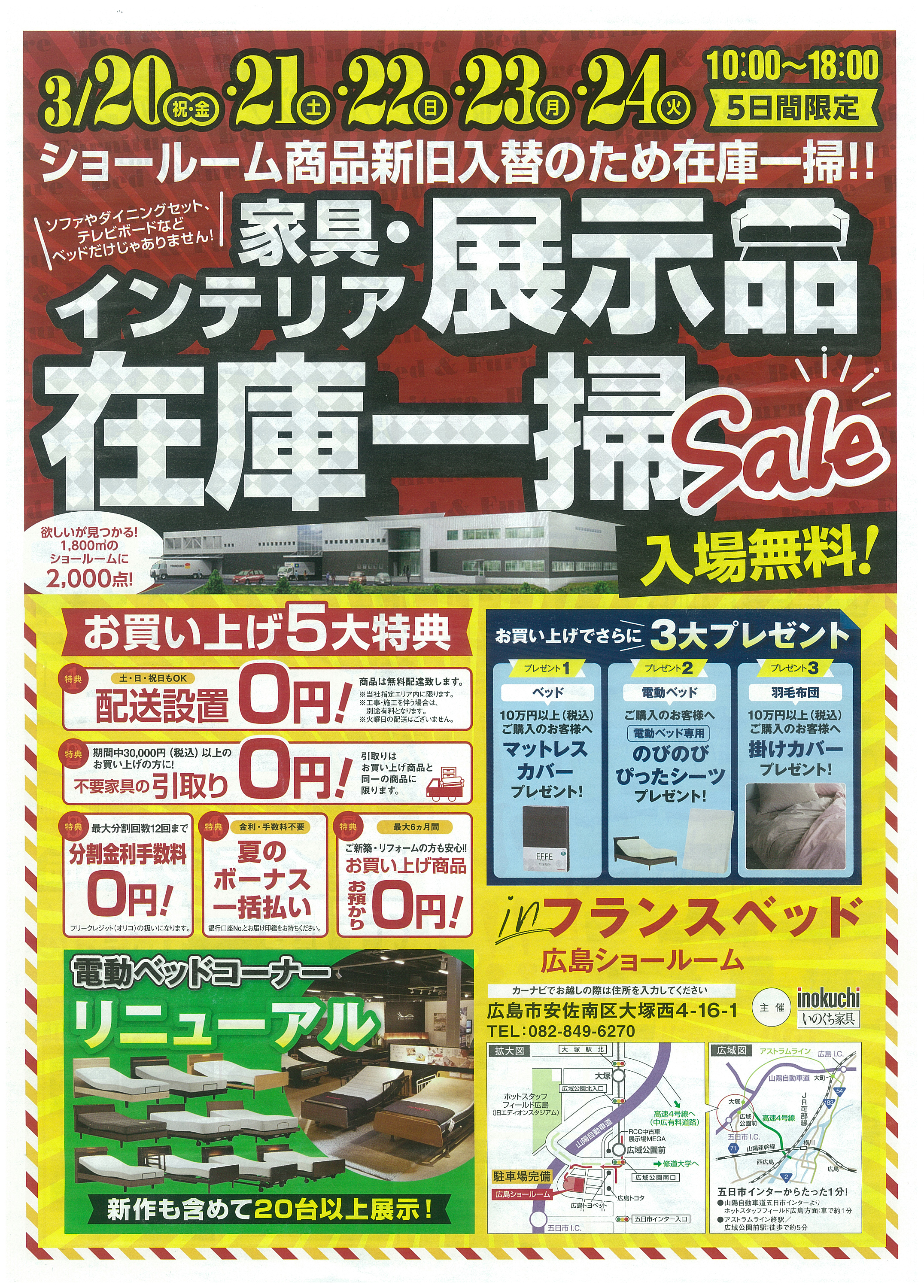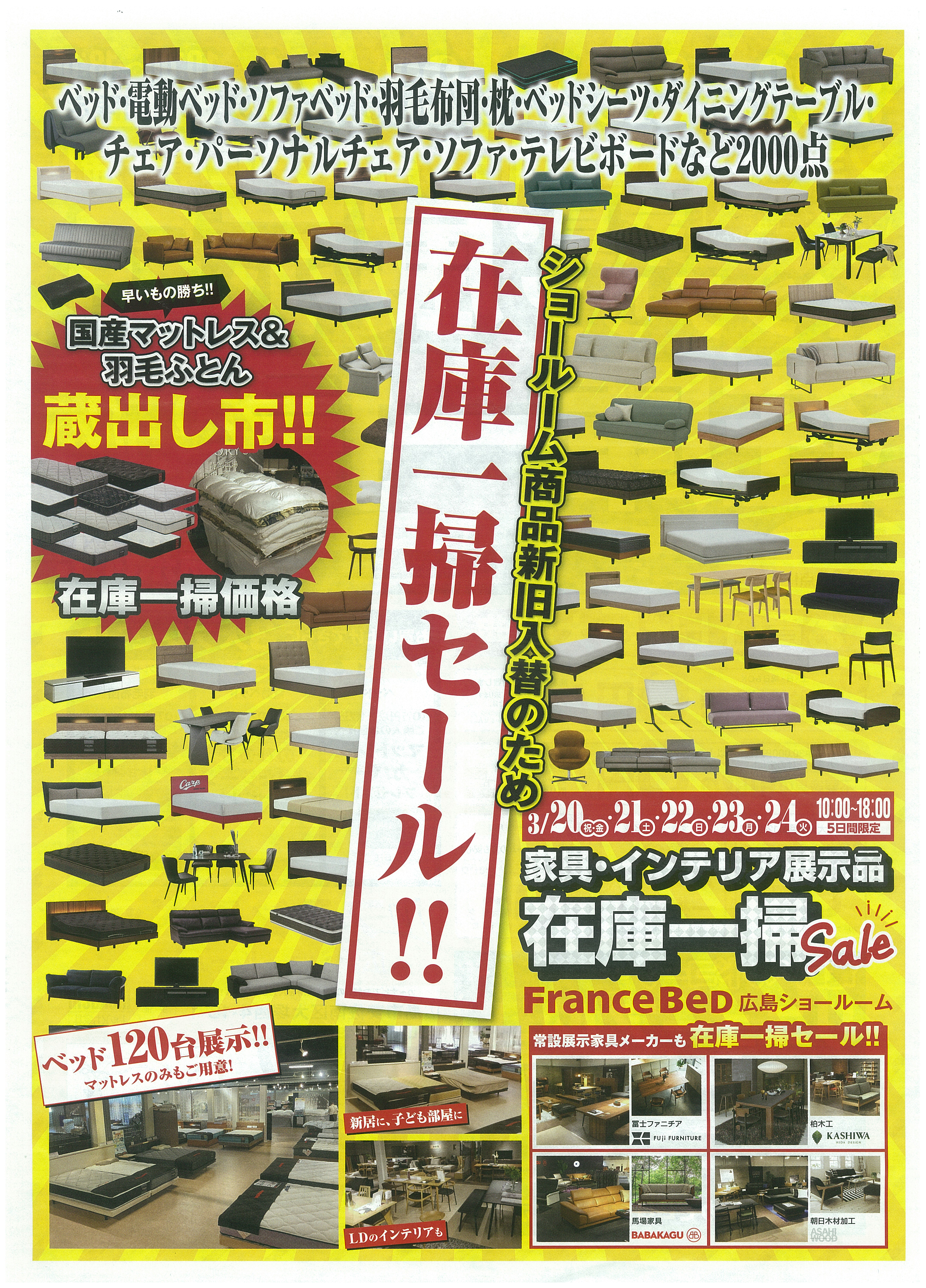 フランスベッド広島ショールームでは家具・インテリアの在庫一掃セールを開催しています。ベッドやソファ、ダイニングセットなどを特別価格で提供。実際に寝心地や座り心地を体感しながら選べるのが魅力です。配送や設置などの特典もあり、新生活や買い替えにおすすめのイベントです。