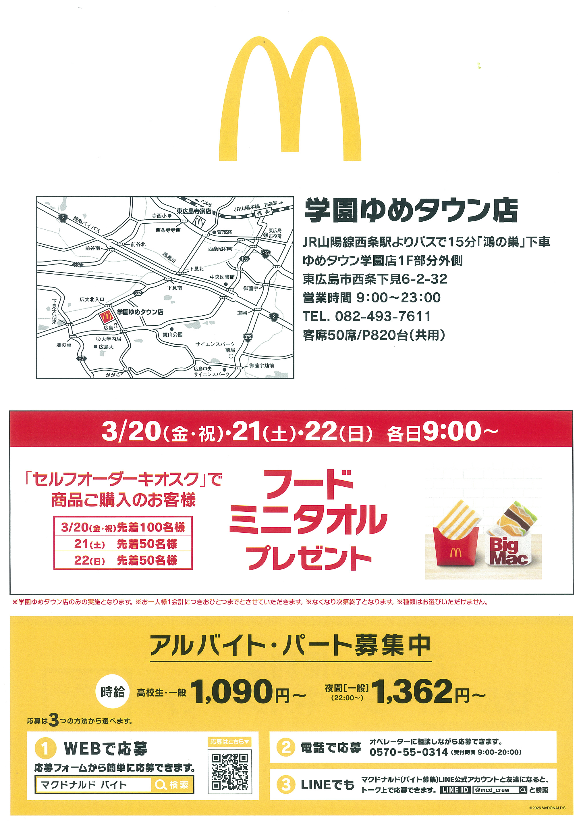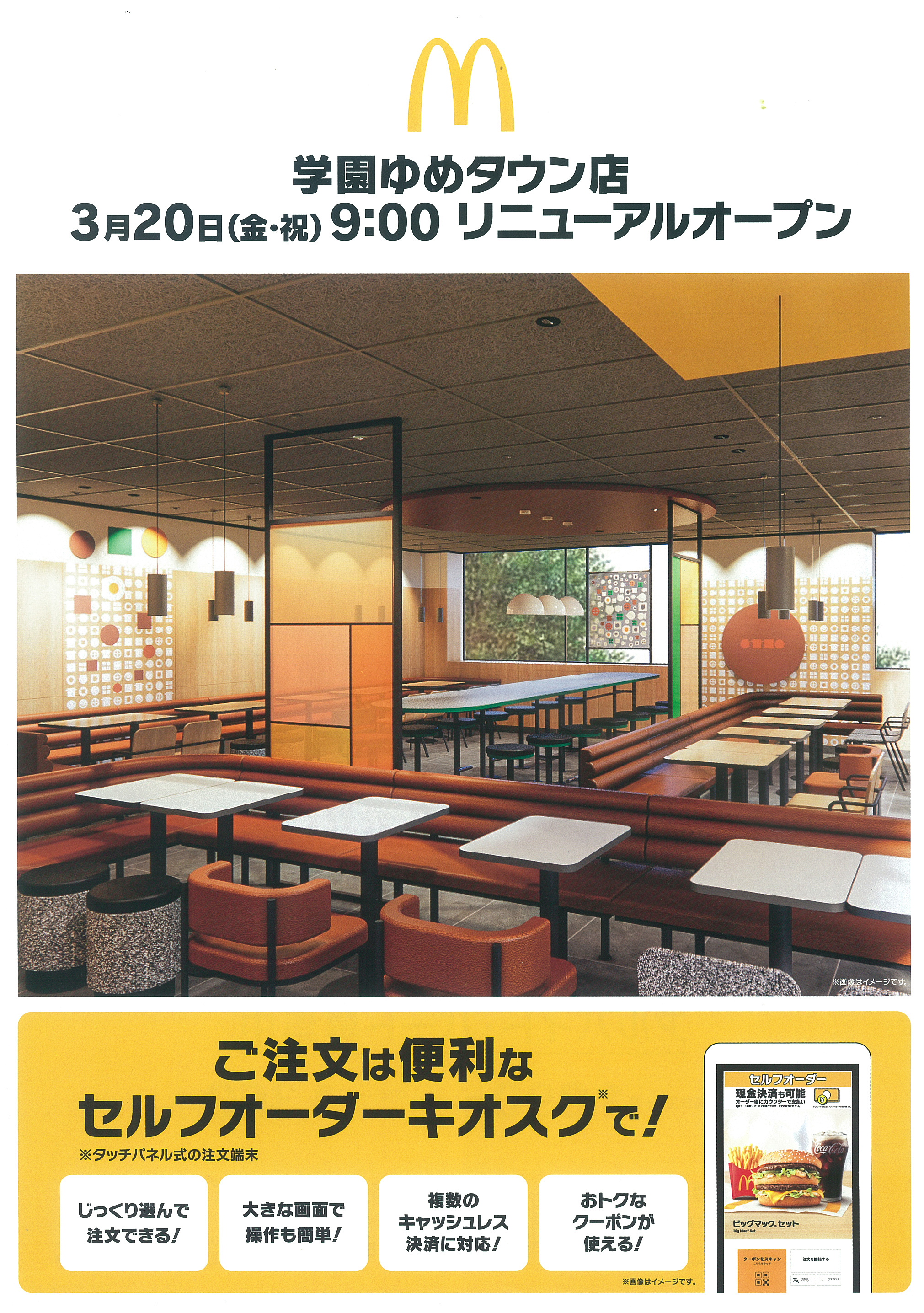 マクドナルド 学園ゆめタウン店が3月20日9時にリニューアルオープンしました。セルフオーダーキオスク導入でスムーズに注文できる便利な店舗へと生まれ変わっています。来店特典企画も実施され、アルバイト・パートスタッフも募集中です。