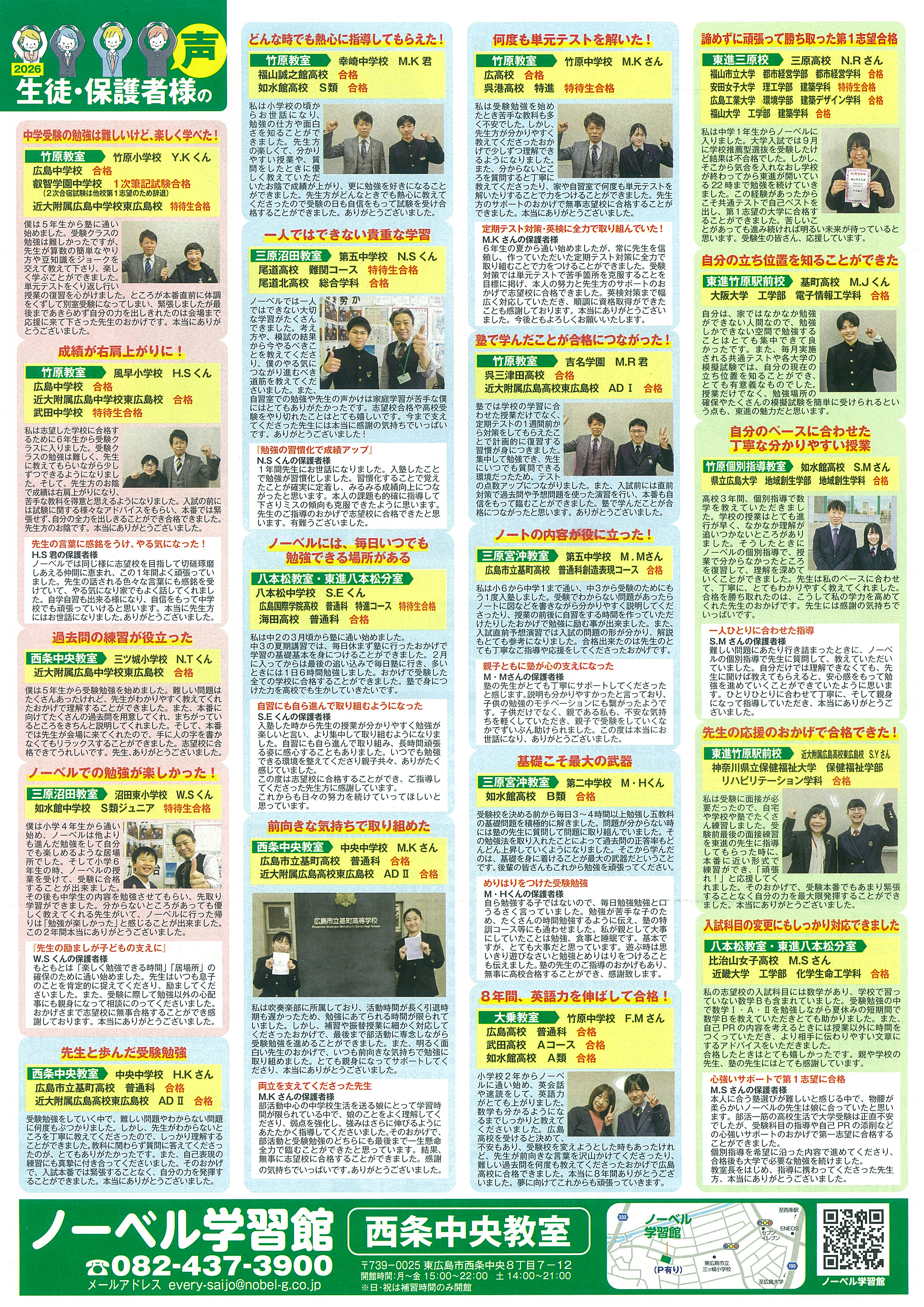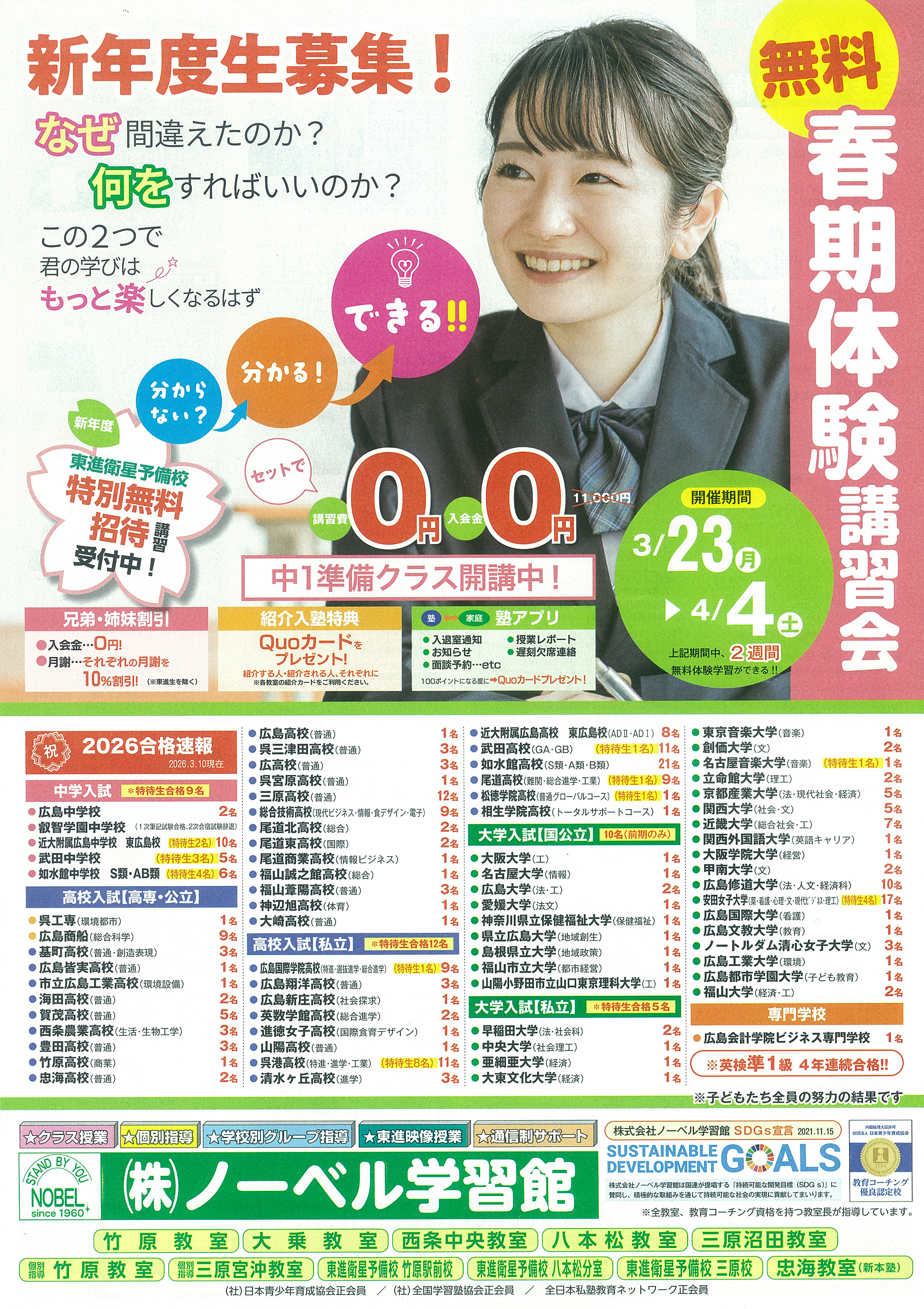 ノーベル学習館では新年度生を募集し、春期無料体験講習を実施しています。個別指導や学校別対策、映像授業を組み合わせて一人ひとりに合った学習を提供。中学・高校・大学受験まで対応し、理解力を高めながら成績向上を目指す学習環境です。