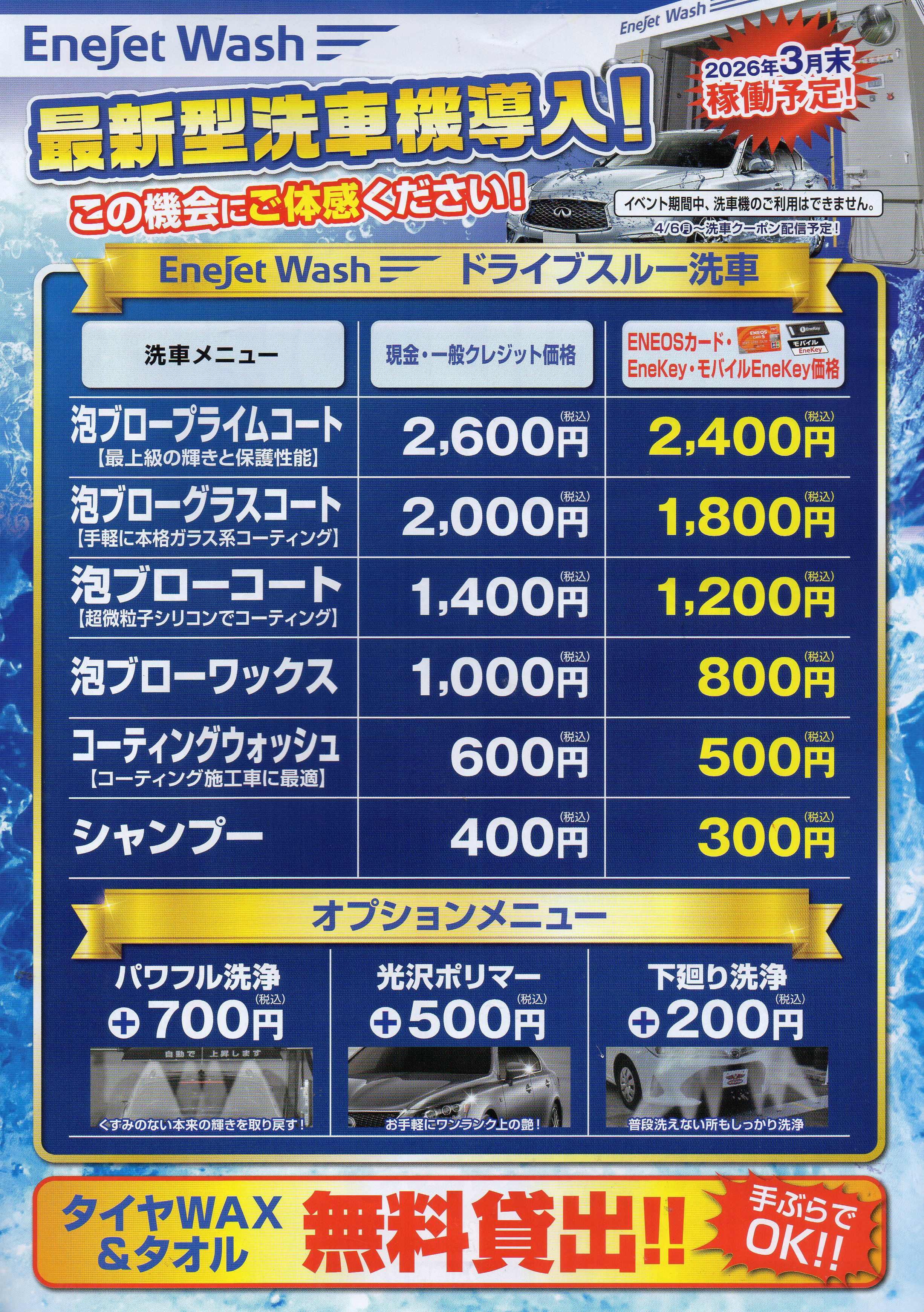 EneJet黒瀬SSではグランドオープンを記念したイベントを開催します。期間は4月3日から5日までの3日間。給油や来場者向けの特典企画が用意されるほか、公式アプリによるクーポン配信やポイントサービスも紹介されます。ドライブスルー洗車機も導入予定で、便利なサービスステーションとして注目です。