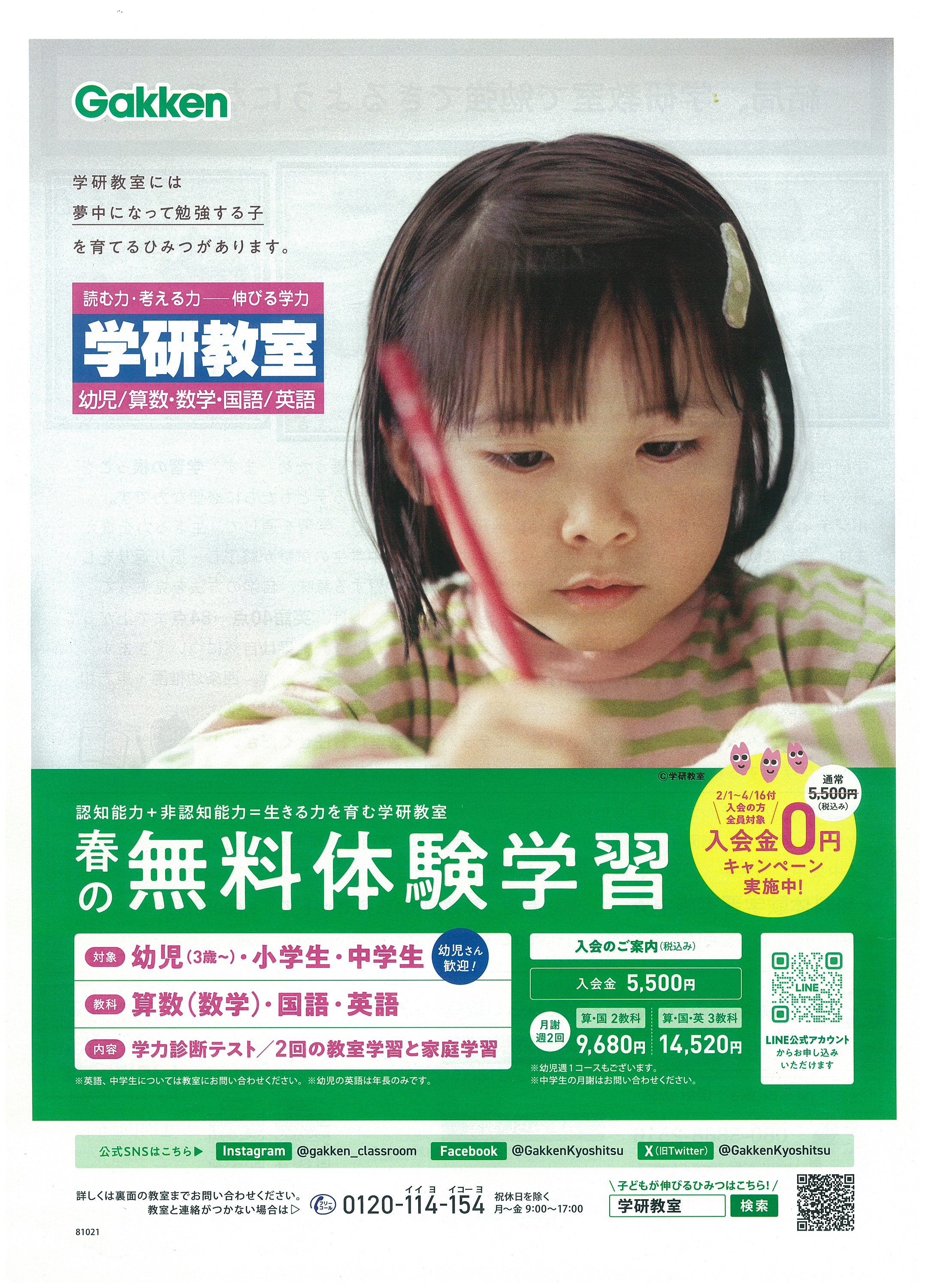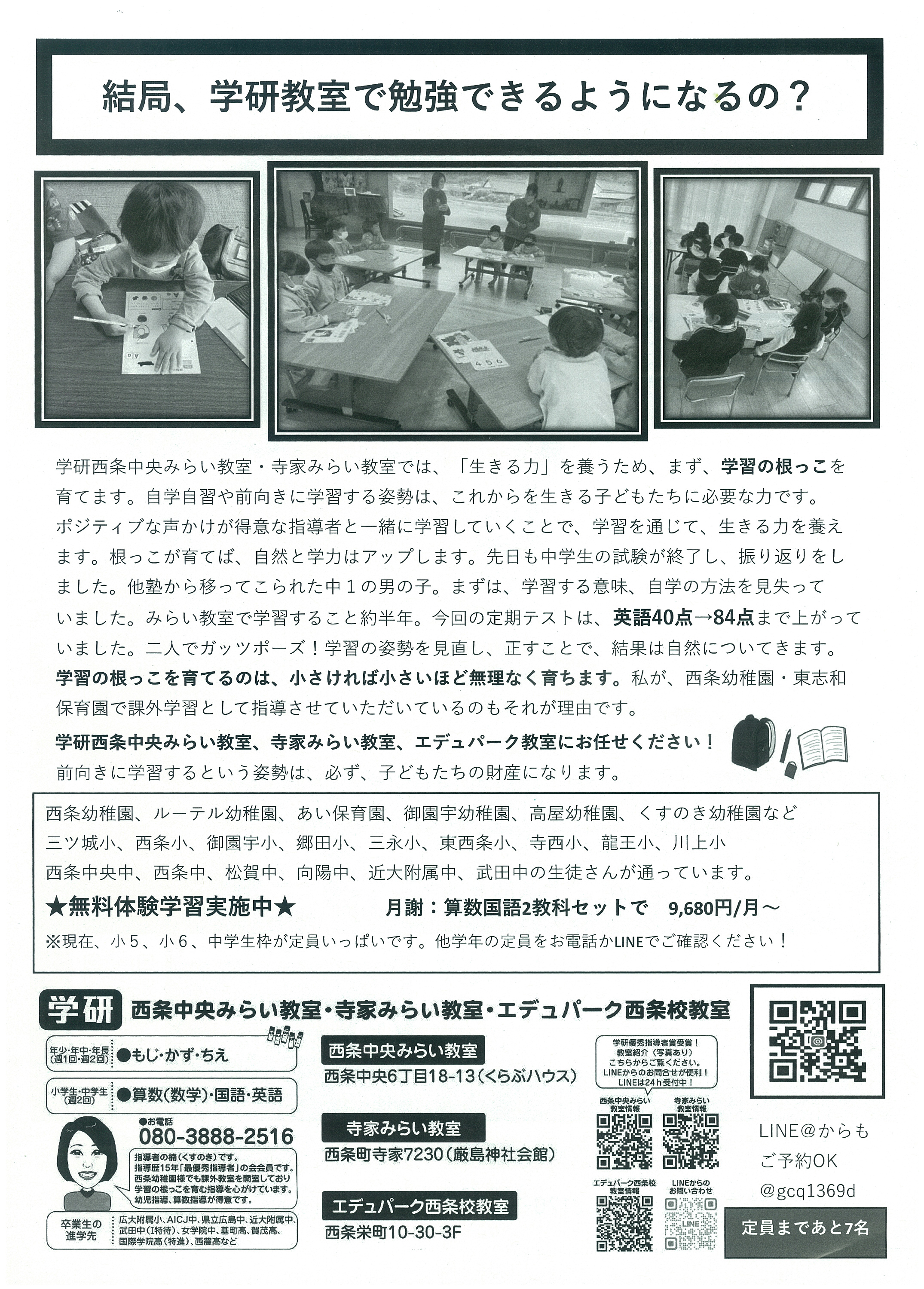 学研西条みらい教室、寺家みらい教室、エデュパーク西条校では春の無料体験学習を実施しています。算数・国語・英語の基礎を中心に、自ら学ぶ力を育てる指導が特徴。学力診断や家庭学習も組み合わせながら学習習慣を身につけられる教室です。