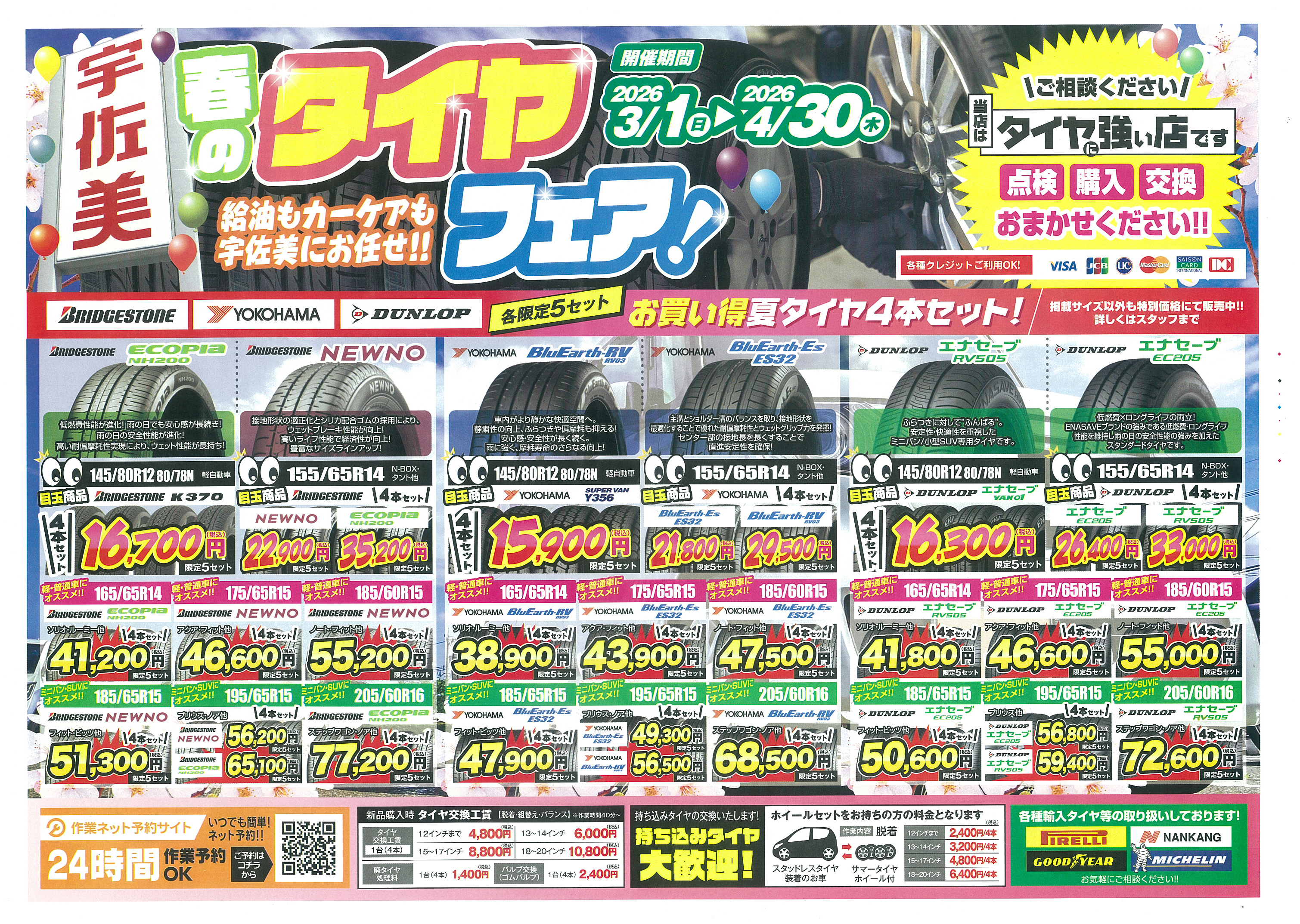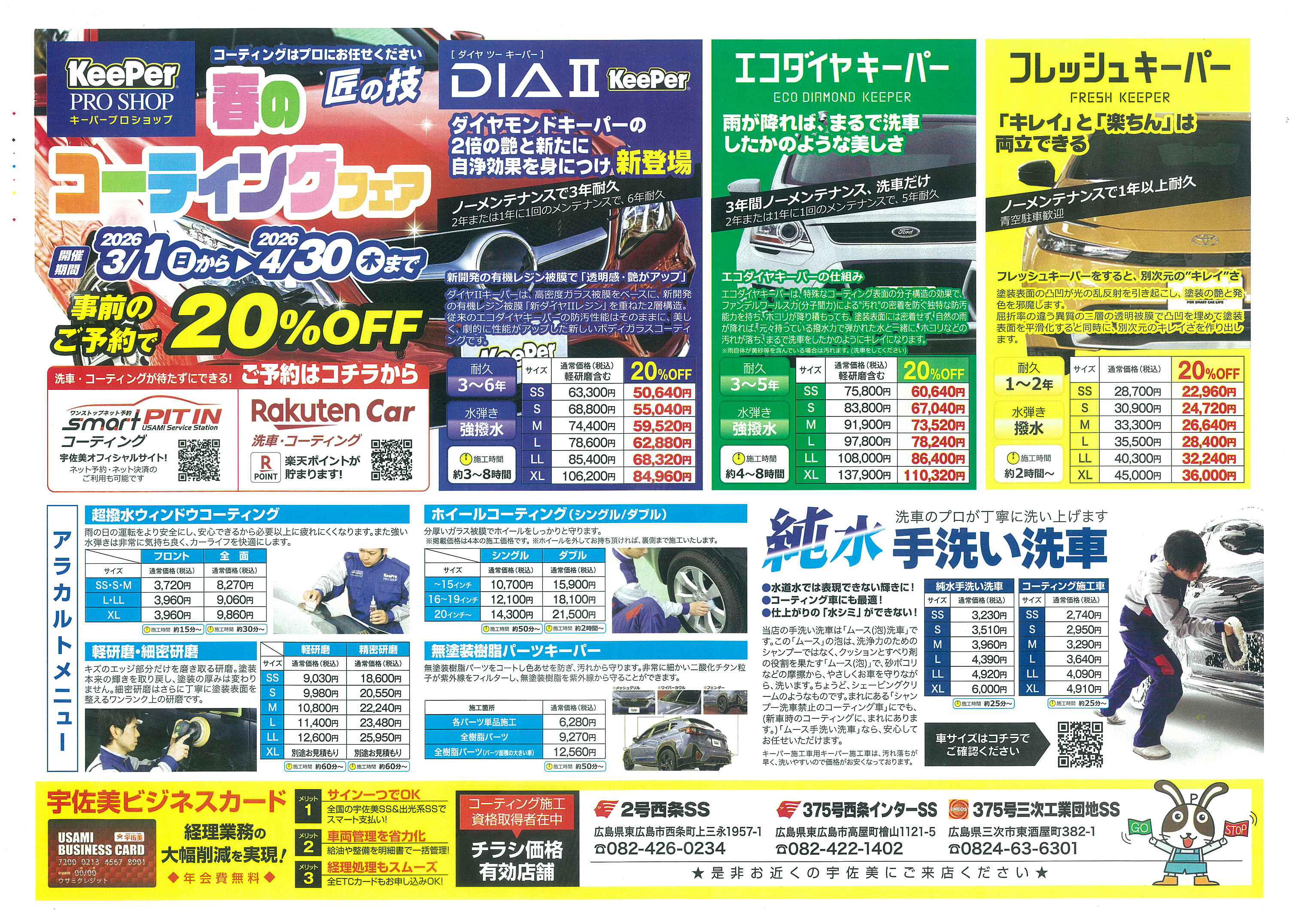 宇佐美では春のタイヤフェアとコーティングフェアを同時開催しています。人気メーカーのタイヤをお得なセットで提供し、点検から交換まで対応。撥水性能に優れたコーティング施工も行っており、春のドライブシーズンに向けたメンテナンスにおすすめです。
