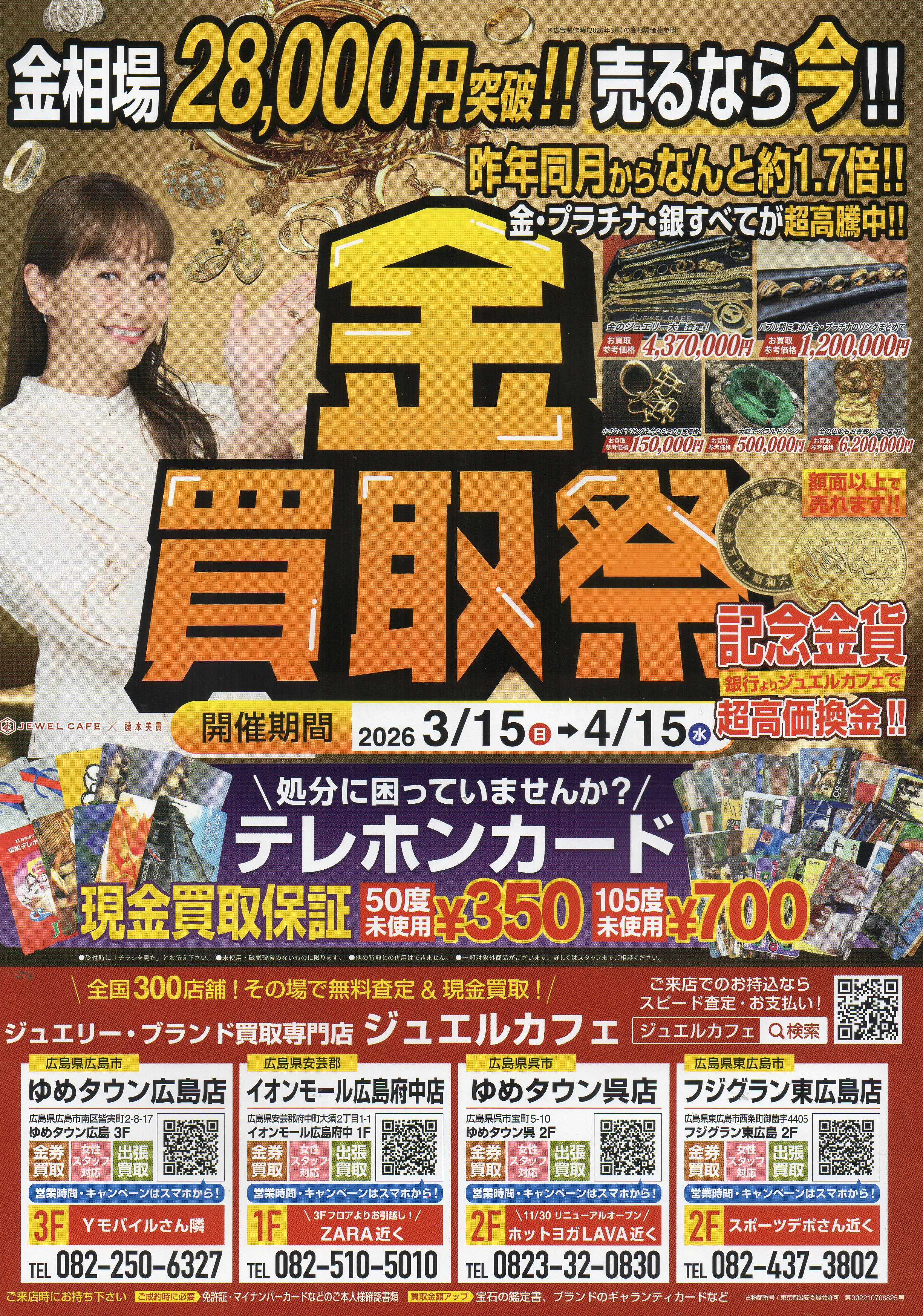 ジュエルカフェでは金相場の高騰を背景に買取強化キャンペーンを実施しています。金やプラチナ、ブランド品、ジュエリーなどを対象に無料査定を実施し、その場で現金買取にも対応。古いものや傷のある品も相談でき、不要品整理の機会として利用しやすい買取サービスとなっています。