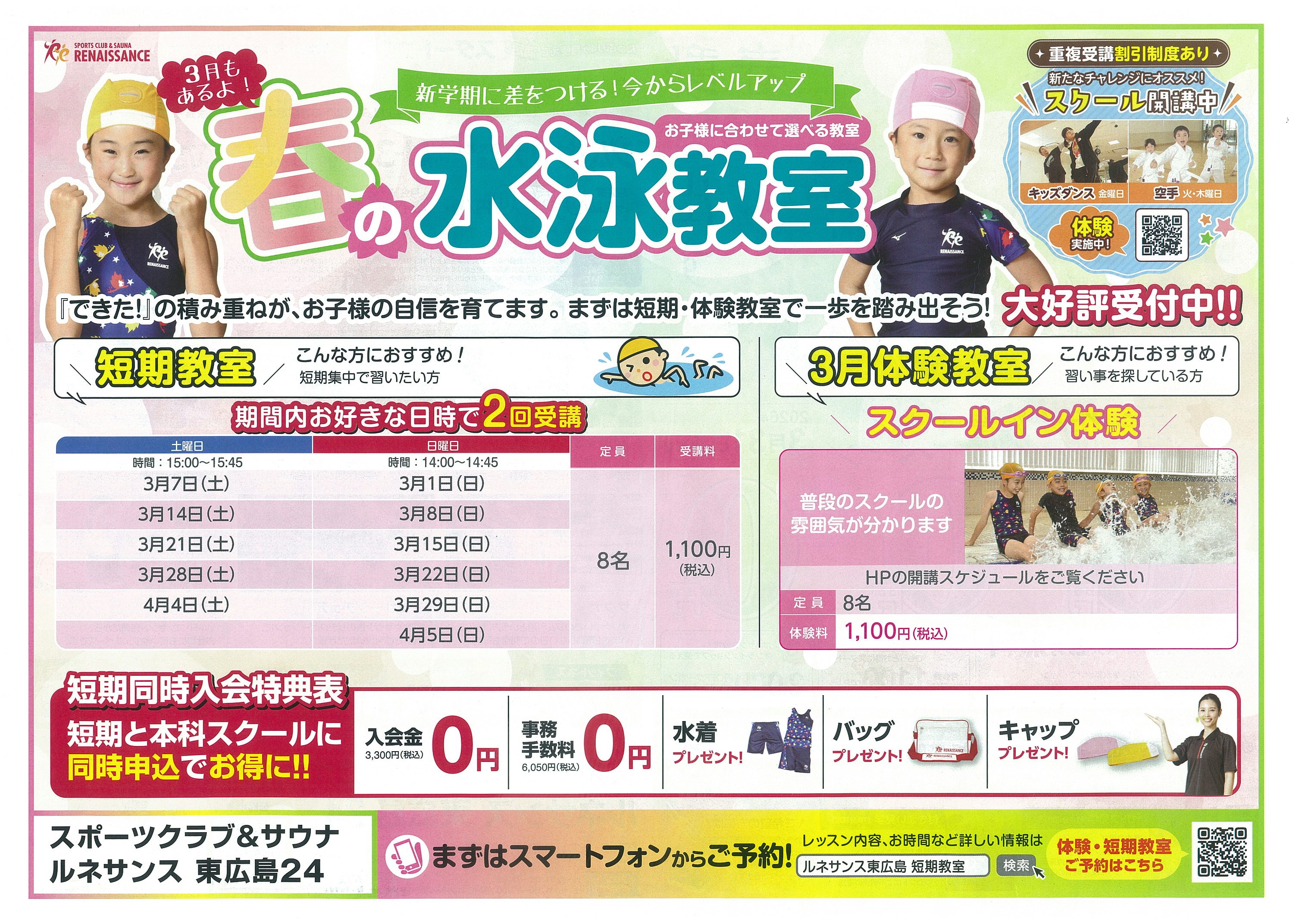 スポーツクラブ&サウナルネサンス東広島24では春の水泳教室を開催しています。短期教室や体験レッスンを通して、水に慣れるところから泳力向上までレベルに合わせた指導を実施。子どもたちの成功体験を大切にしたプログラムで、新しい習い事として人気です。