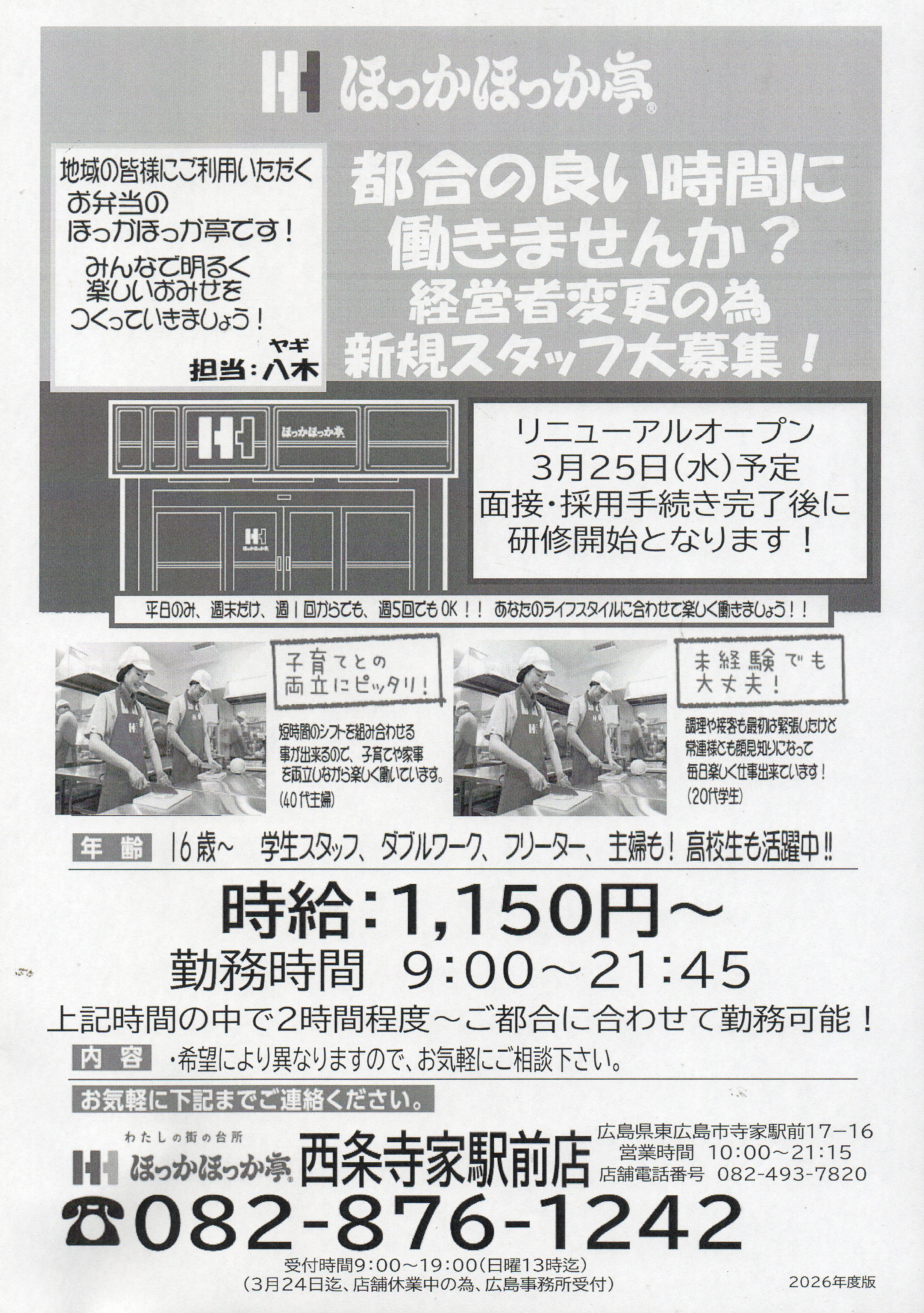 ほっかほっか亭西条寺家駅前店ではリニューアルオープンに伴いスタッフを募集しています。勤務は9時〜21時45分の間で短時間から可能。未経験でも研修があり安心して始められます。学生や主婦、ダブルワーク希望の方など幅広い世代が働きやすい職場環境です。