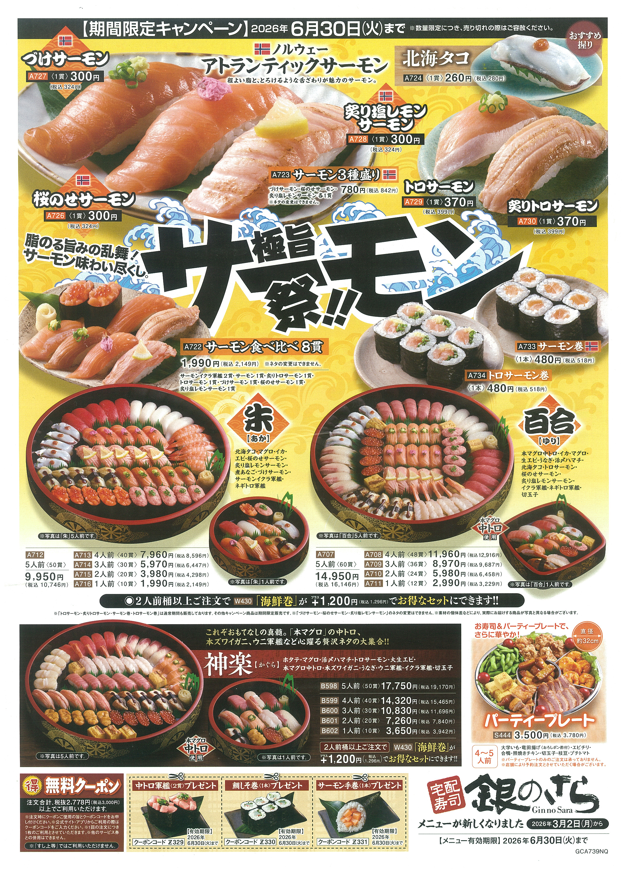 宅配寿司の銀のさらでは、サーモンを中心とした期間限定フェアを開催しています。脂ののったサーモンの握りや巻き寿司、食べ比べセットなど多彩なメニューを用意。盛り込み桶やセットも充実しており、家族の食事や集まりの場にも便利。お得なクーポンも利用できます。