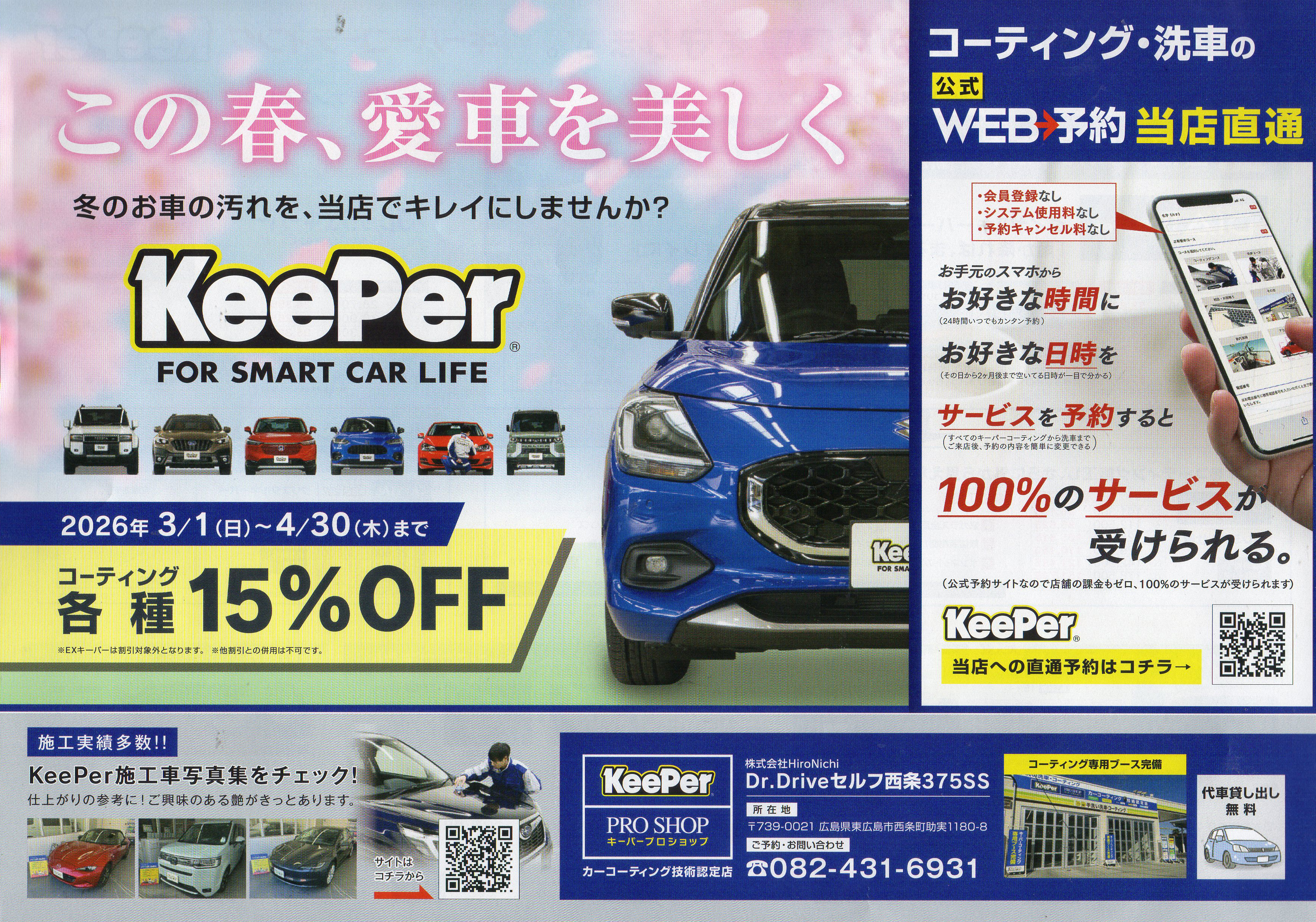 Dr.Driveセルフ西条375SSでは春のカーケアキャンペーンを実施しています。コーティングメニューが期間限定で割引となり、冬の汚れやダメージをリセットする絶好の機会。自浄効果や艶のある仕上がりが特徴で、WEB予約にも対応。愛車をきれいに保ちたい方におすすめです。
