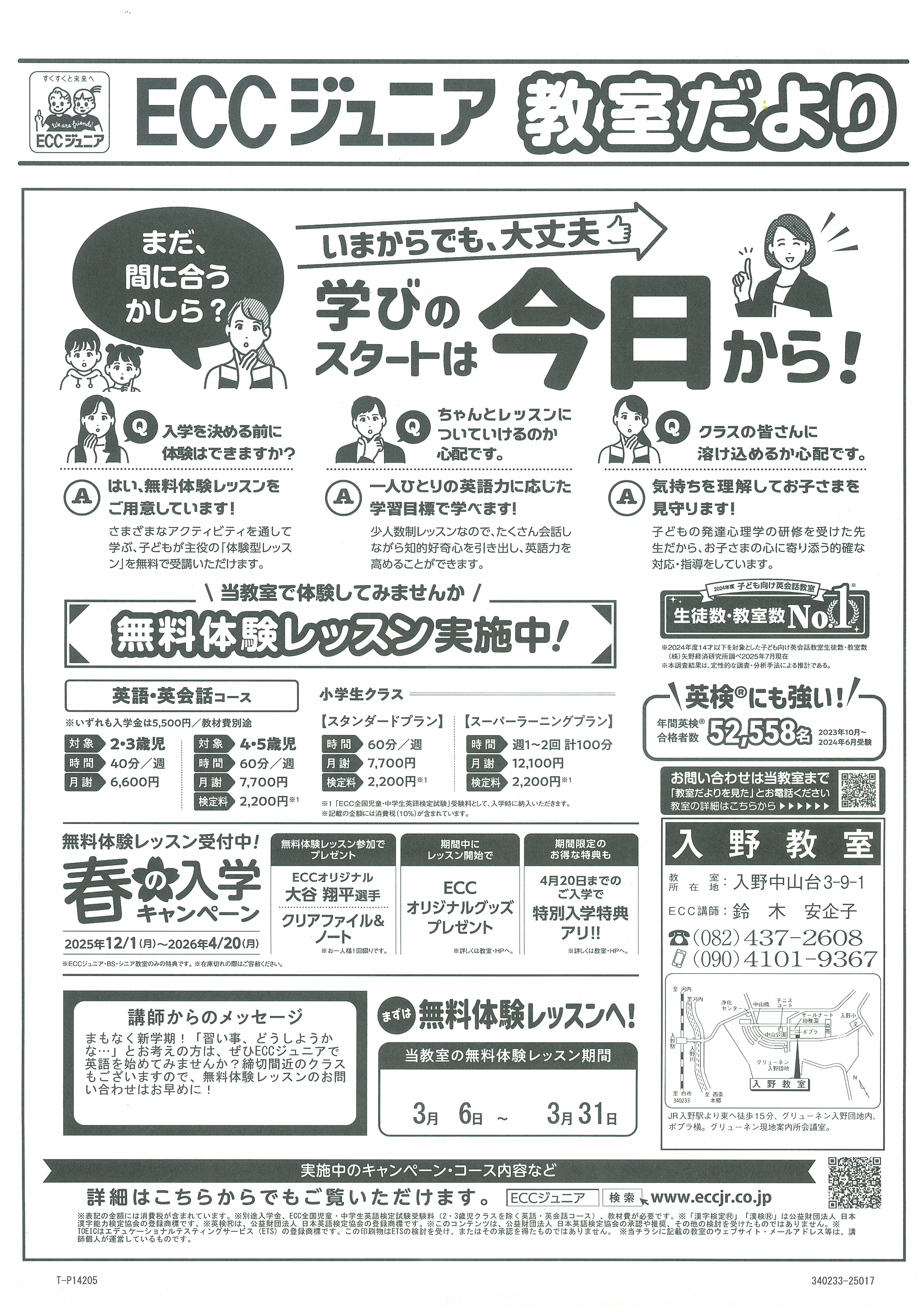 ECCジュニア入野教室では春の入学キャンペーンを実施しています。聞く・話す・読む・書くの4技能をバランスよく学び、少人数制レッスンで一人ひとりの理解度に合わせて指導。歌やゲームを取り入れた授業で英語を使う楽しさを育てます。無料体験レッスンも実施しており、初めてでも安心して始められます。