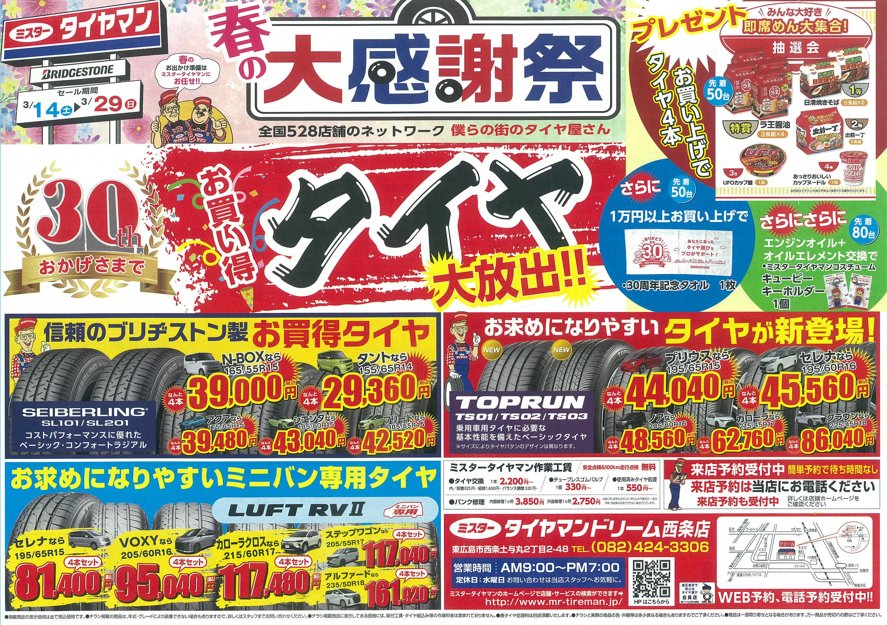 ミスタータイヤマン西条店では春の大感謝祭を開催。ブリヂストン製タイヤを中心に、軽自動車からミニバンまで幅広い車種のタイヤを特別価格で提供しています。購入特典やプレゼント企画もあり、春のドライブシーズンに向けたタイヤ準備におすすめのセールです。