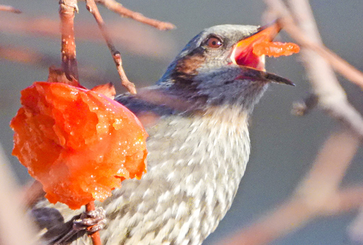 しかし1月11日、メジロやスズメ、ムクドリ、ヒヨドリが入れ代わり立ち代わり飛来して柿の食べ放題を始めたのです。写真は果肉をむしり取って食べているヒヨドリです。