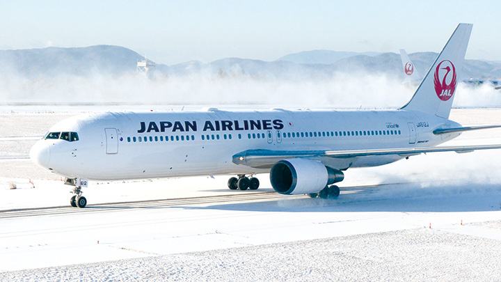 雪が降った朝、広島空港一帯は白一色の世界が広がります。離陸のため補助滑走路をゆっくりと進むJALの機体も白。