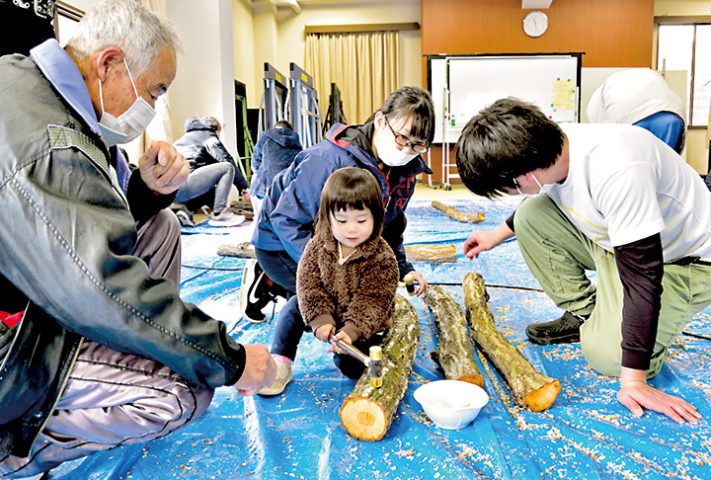 1月22日、クヌギやコナラの原木にシイタケの菌を打つ植菌体験が八本松町原地域センターで行われました。森林や林業に関する知識(森林環境教育の一環)の普及を図るため自治協議会が主催。