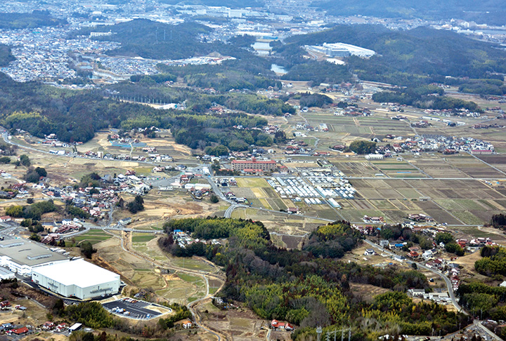 写真では、原盆地の中心地、農業技術センターから八本松駅に広がる広大な住宅団地、道の駅西条のん太の酒蔵が望めます。熱気球とは違った15分のフライトを楽しむことができました。