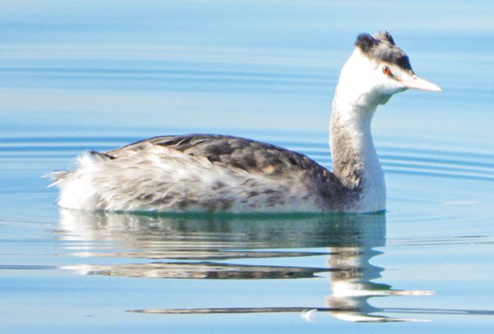 安芸津町の海岸を車で走っていると、潜水を繰り返す鳥がいました。長い首と頭上の冠羽、カンムリカイツブリです。