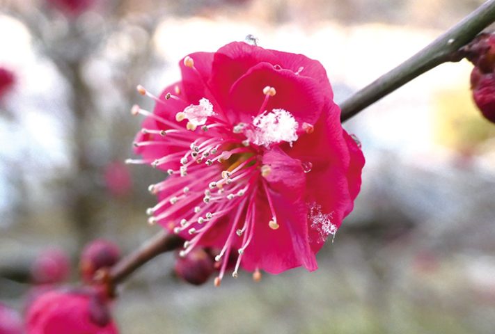 蕾(つぼみ)には雪がないのに、数輪の満開の花には雪がのっていました。朝日が当たるとすぐに雪は溶けて消えてしまいましたが、幻想的な紅梅の姿はカメラの中に残っていました。