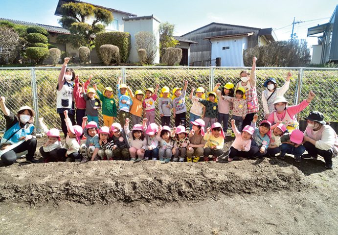東広島市立原保育所(大武典子所長)で3月20日、年少組15名、年中組12名が恒例行事のジャガイモの植え付け体験をしました。半分に切った種芋を一個ずつ持ち、一列になって10㌢ほどの穴に切り口を下にして埋めていきます。