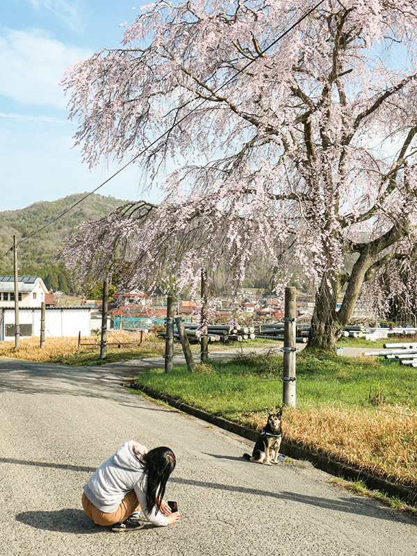 三永の一本桜を撮影に行くと、散歩中の女性が愛犬を桜の下に座らせて写真を撮っていました。
