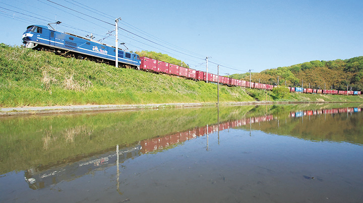 田植え前に水を入れた水田は水鏡のようになります。鉄道写真のマニアなら水面に映る列車を写したくなります。そこで快晴で無風の日を選んで撮影に。ダイナミックな貨物列車の姿を上下に重ねて写すことができました。30分後には風が出てきたので、水面が波立って、水鏡は消えてしまいました。