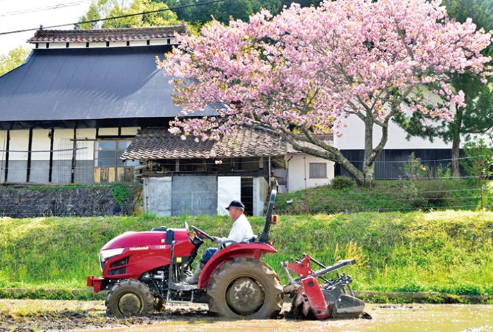 日本人の心の奥にある、どこか懐かしさを感じる風景に出合いました。水を張った水田で、田植えの準備の代かきが行われていました。古い屋敷と満開の八重桜をバックに絶好のアングル。トラクターで作業されている方に声を掛け、カメラに収めさせてもらいました。