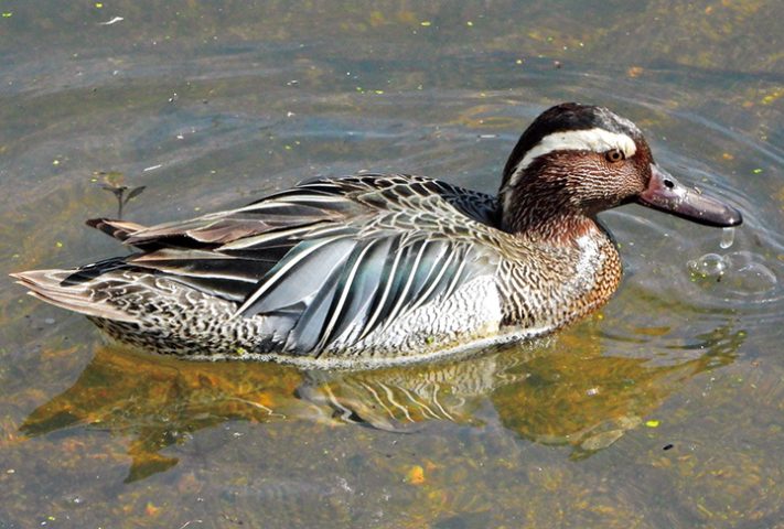 双眼鏡で確認すると息が止まりました。珍しいカモ、シマアジだからです。すぐに草むらに隠れて撮影しました。目の上の白い模様が仙人のように見えます。