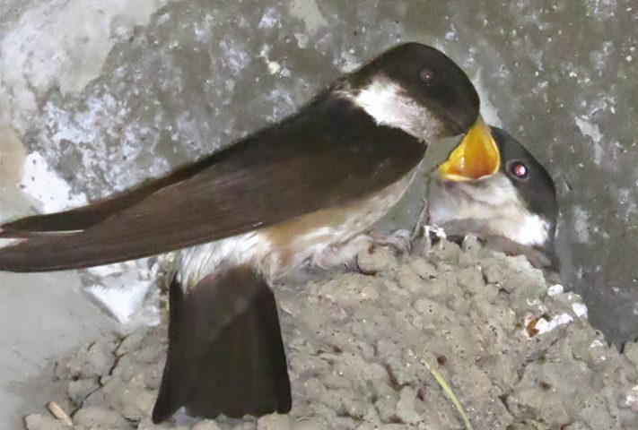 イワツバメは橋の下へ飛んで行ったので行ってみると巣があり、3羽のひなが留守番をしていました。観察していると、30分に1回くらい親が餌を運んできて、ひなは黄色い大きな口を開けてアピールしています。