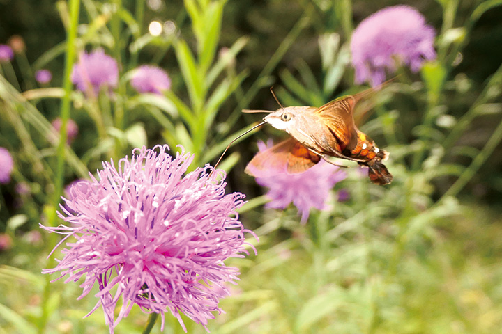 私は5年ぶりに出合ったので撮影していると、ホシホウジャクが飛んできて、長い口先をストローのように伸ばして蜜を吸い始めました。両方写った写真が一枚だけ撮れました。