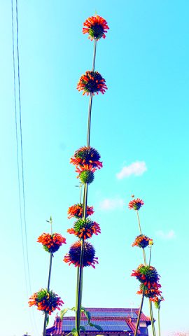 つくり物のような花が目に入り近寄ってみると、炎のようなオレンジ色の花と、その表面にまとわりつく綿毛からカエンキセワタ(火炎着せ綿)という名が付いた花でした。花の真ん中を茎が突き抜け、その先にまた花を咲かせ、1本の茎に3~4輪の花を咲かせて、2㍍ほどの高さに達していました。
